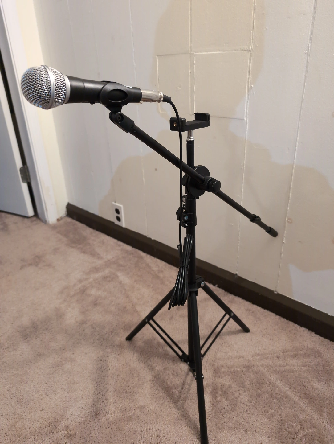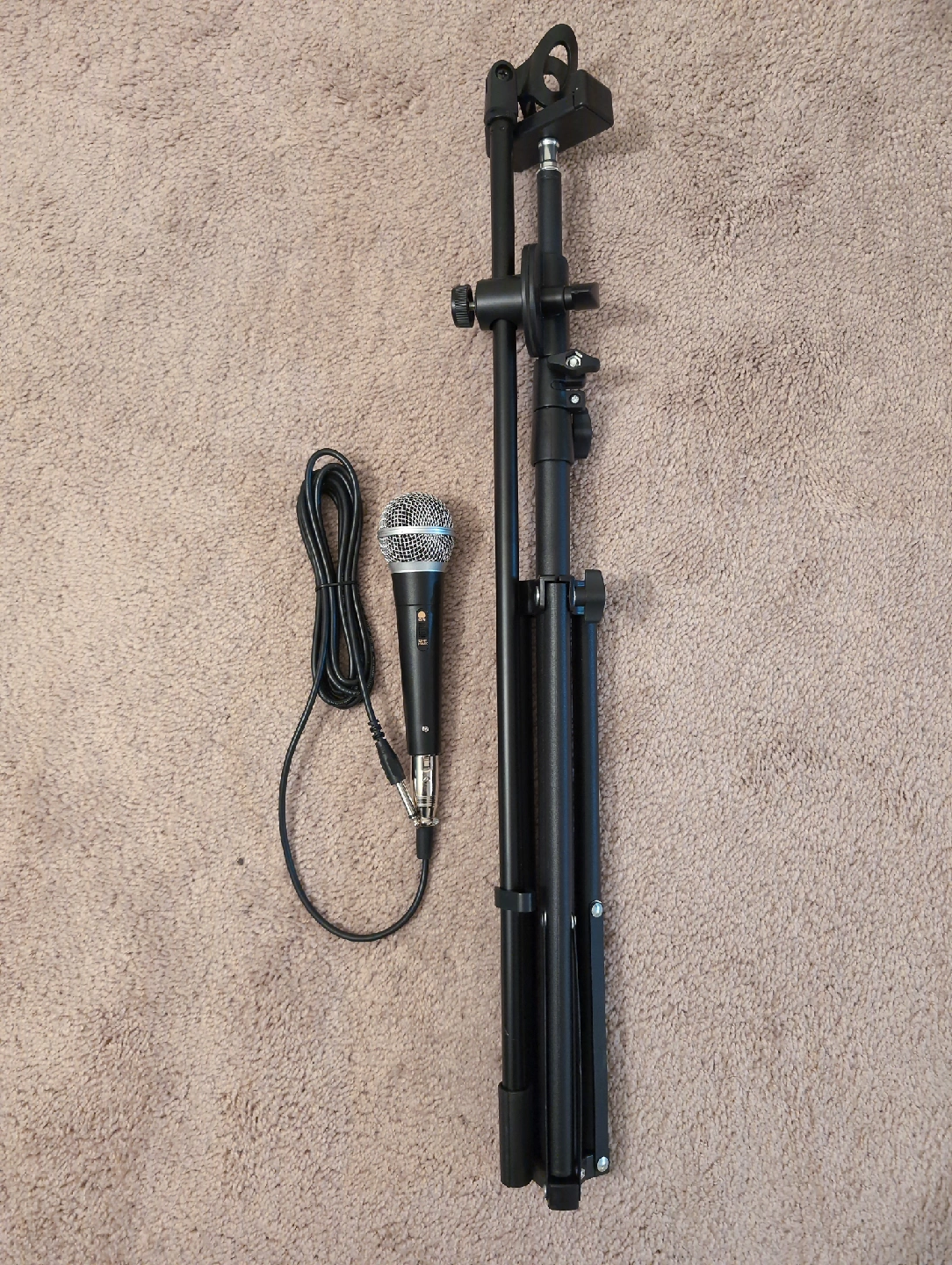 Selling a microphone with a stand. Great for karaoke or recording! Microphone is in good condition and comes with the stand and cable