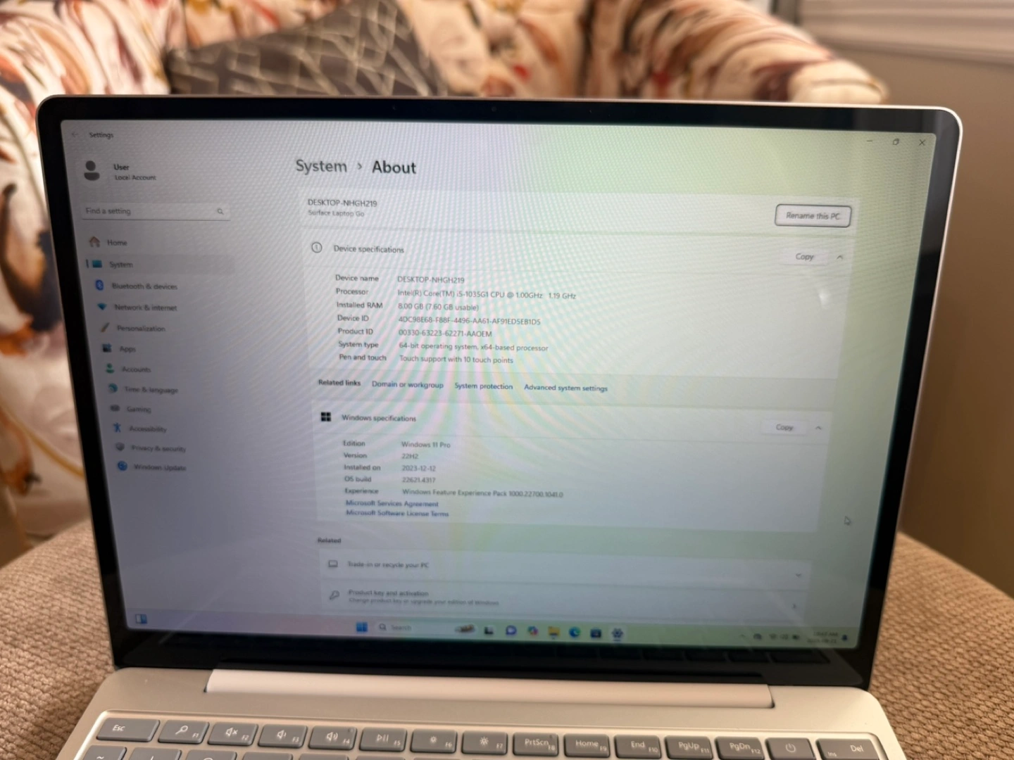 Selling a Microsoft Surface Laptop Go. It's in great condition and ready for a new home. Here are some details: - Processor: Intel Core i5-1035G1 CPU @ 1.00 GHz - Installed RAM: 8.00 GB (7.87 GB usable) - System type: 64-bit operating system, x64-based processor - Pen and touch: Touch support with 10 touch points - Edition: Windows 11 Pro - Version: 22H2