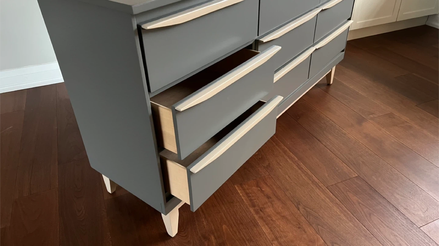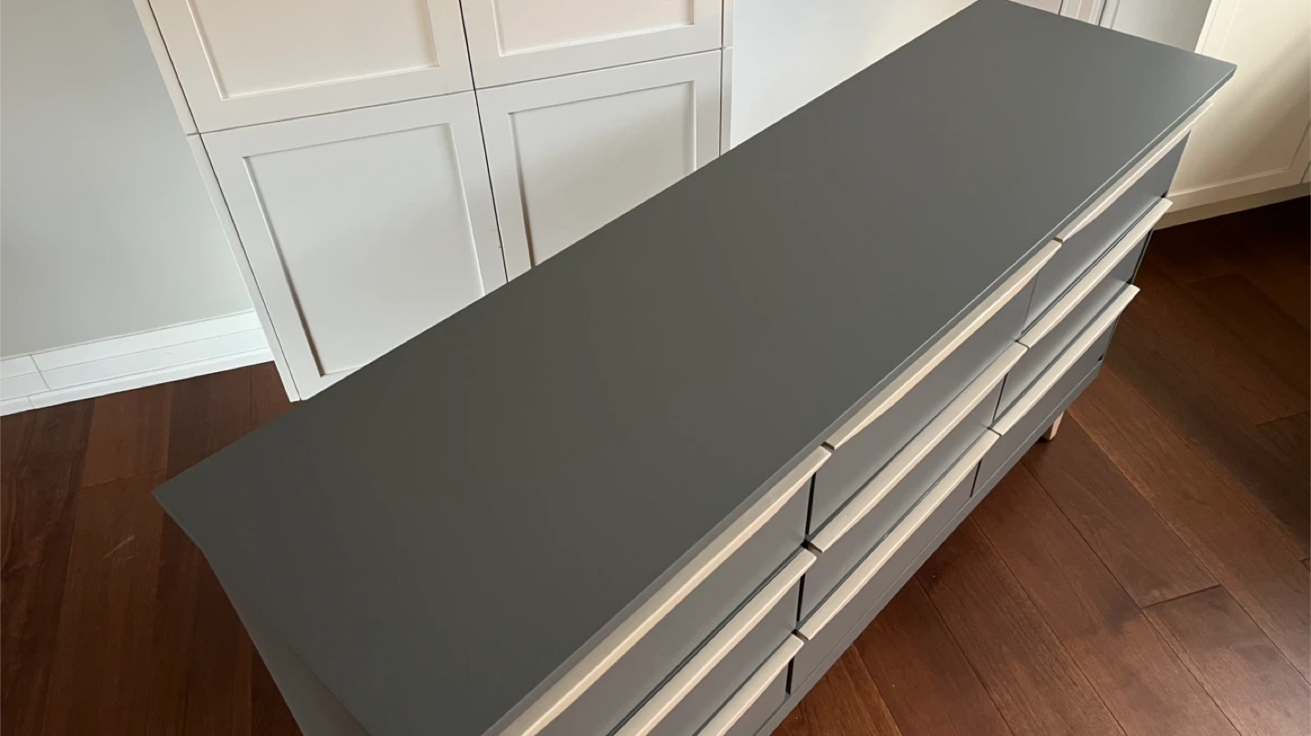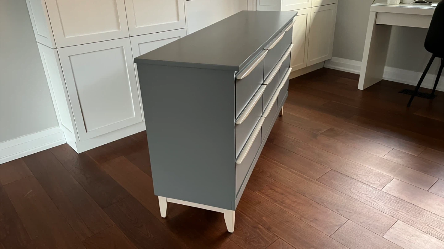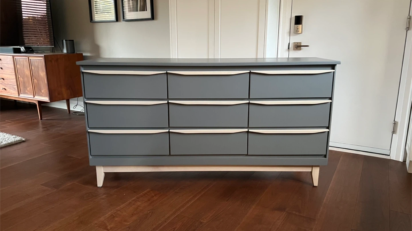 31Dimensions: Width: 60” Depth: 17” Height: 32” This vintage mcm 9 drawer dresser has been sanded back to bare wood, and spray painted (Benjamin Moore Cabinet Coat in the colour Kendall Charcoal). New wood pulls have been added to all drawers and the handles and legs assembly have been given a light coloured paint wash and top coat. The inside has been waxed. All drawers run smoothly. This is a small 9 drawer dresser (note only 17" deep). It could also be used to display a TV. See more of my re-do's on Instagram: @mcm_redo Pick up in South Ajax (Harwood & Clements) Delivery in GTA $75