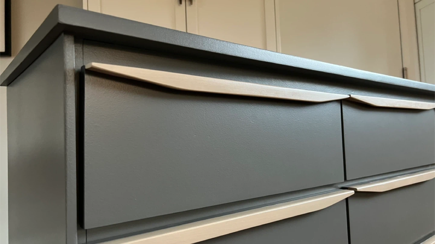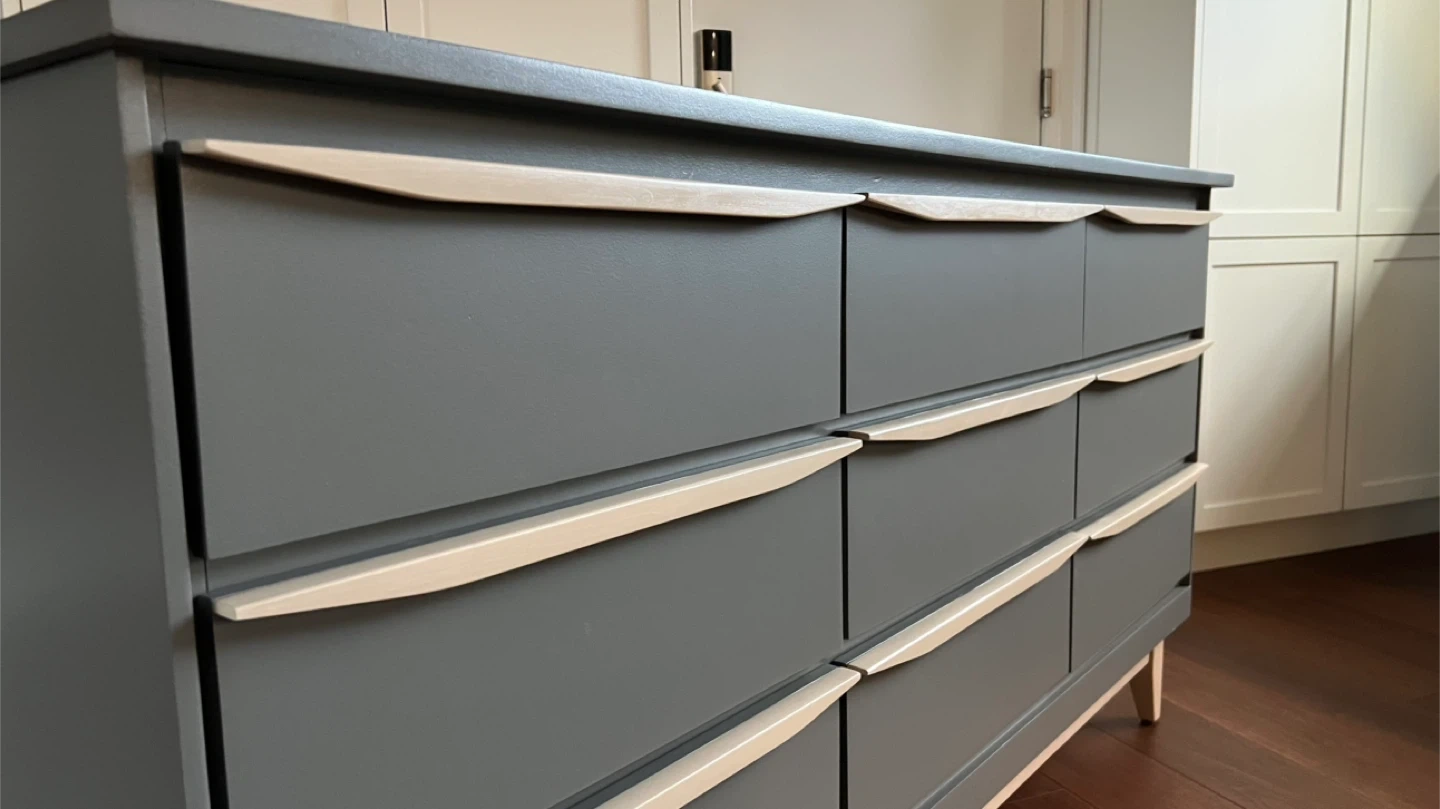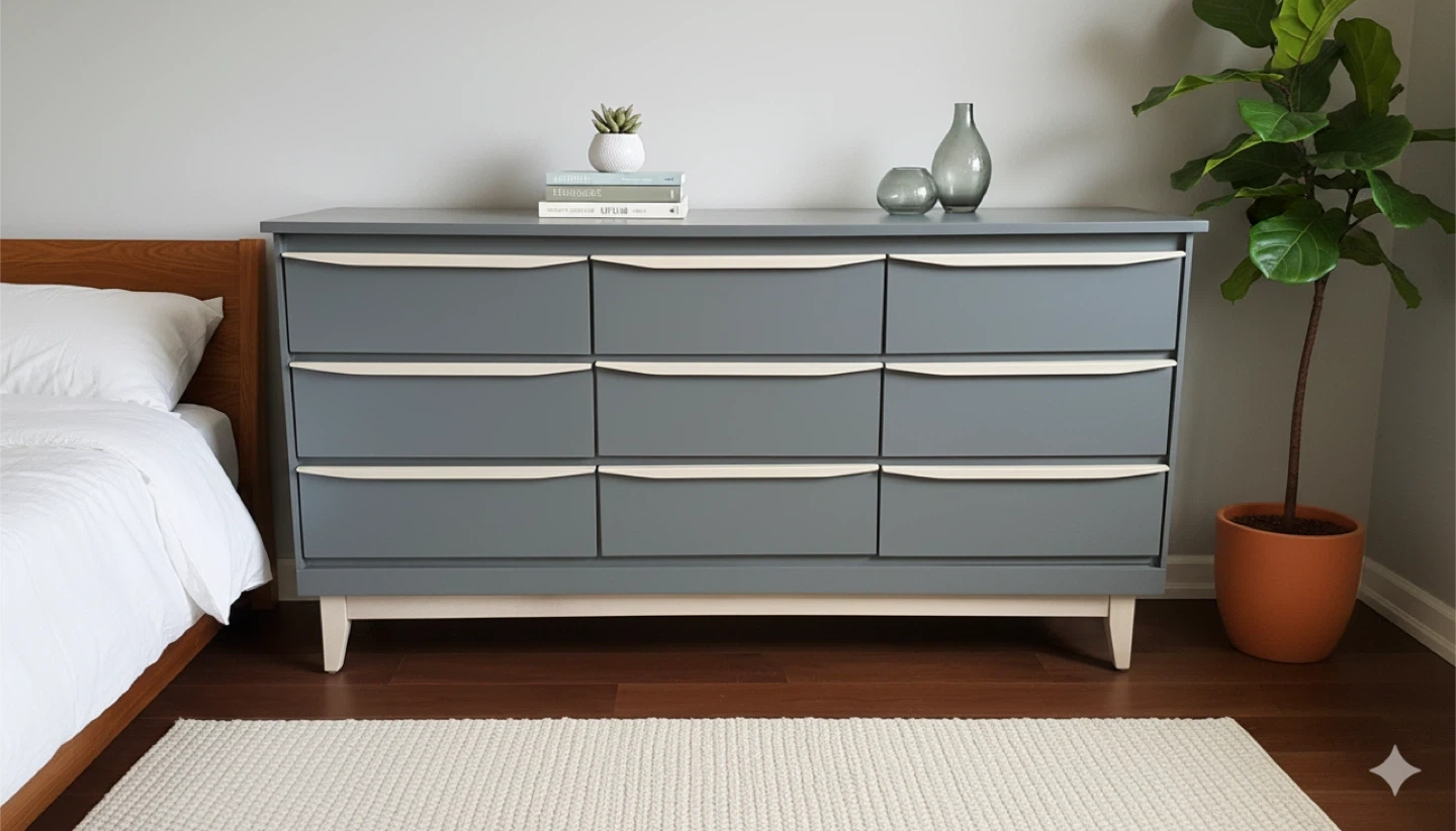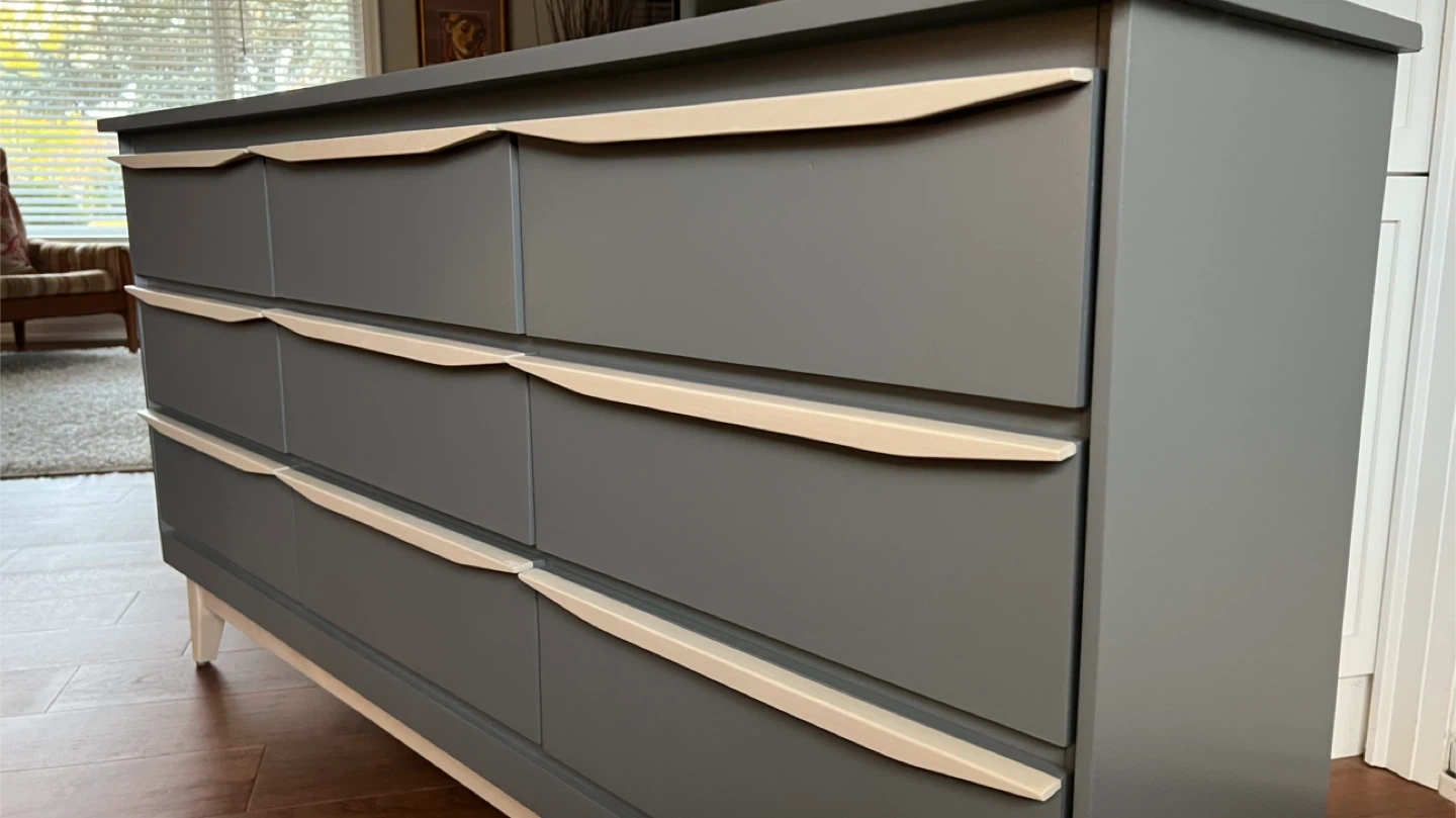 31Dimensions: Width: 60” Depth: 17” Height: 32” This vintage mcm 9 drawer dresser has been sanded back to bare wood, and spray painted (Benjamin Moore Cabinet Coat in the colour Kendall Charcoal). New wood pulls have been added to all drawers and the handles and legs assembly have been given a light coloured paint wash and top coat. The inside has been waxed. All drawers run smoothly. This is a small 9 drawer dresser (note only 17" deep). It could also be used to display a TV. See more of my re-do's on Instagram: @mcm_redo Pick up in South Ajax (Harwood & Clements) Delivery in GTA $75