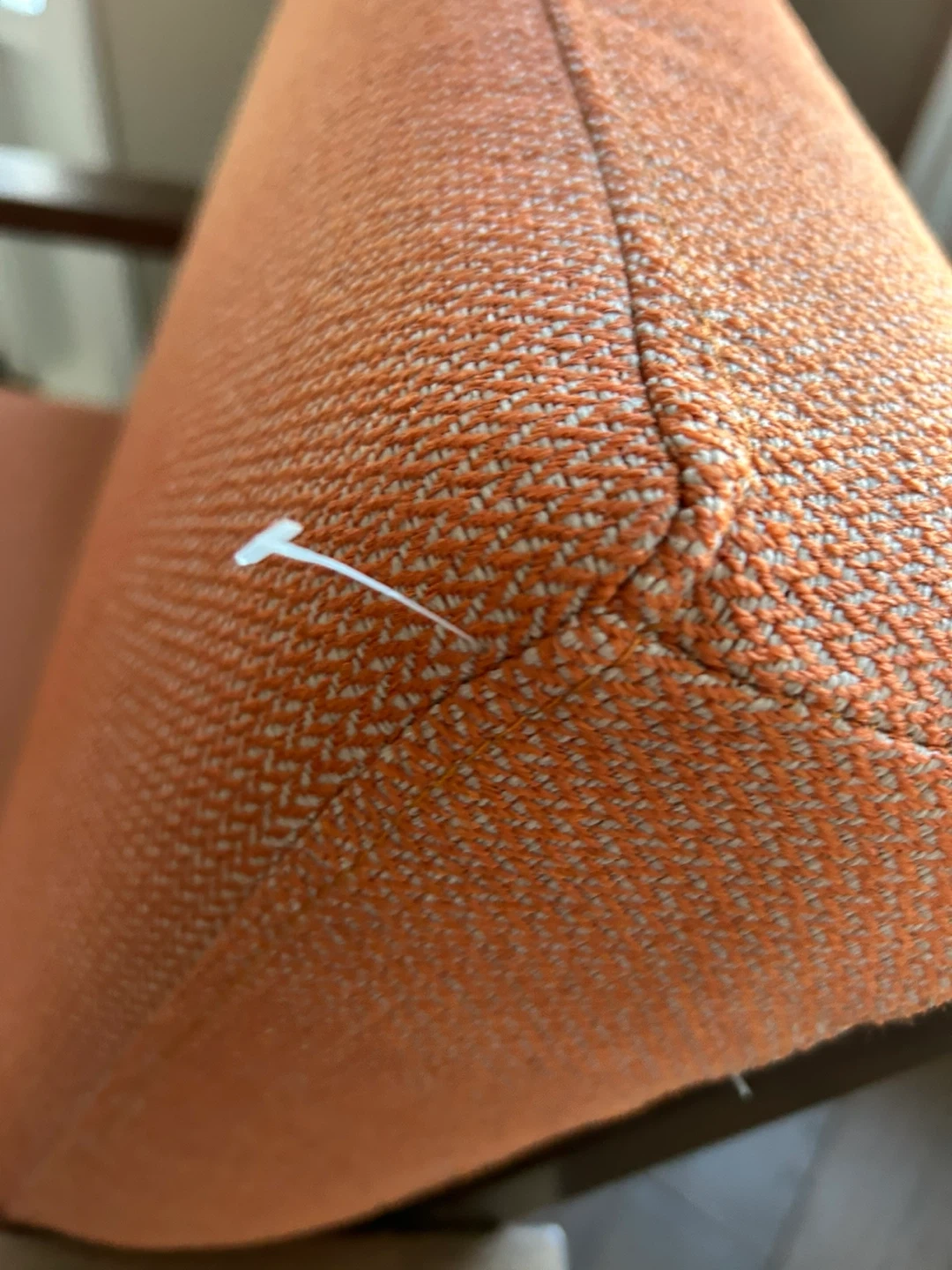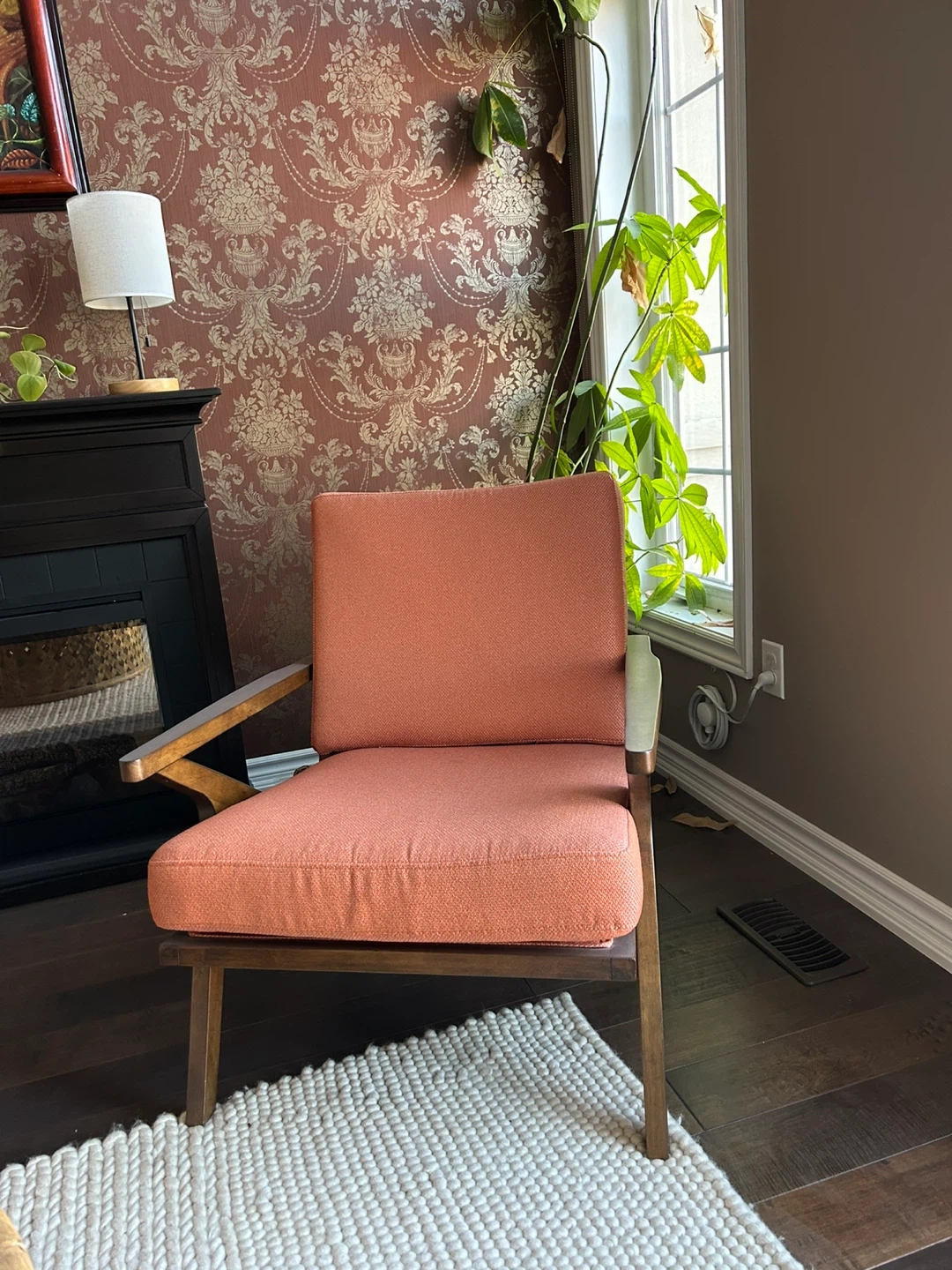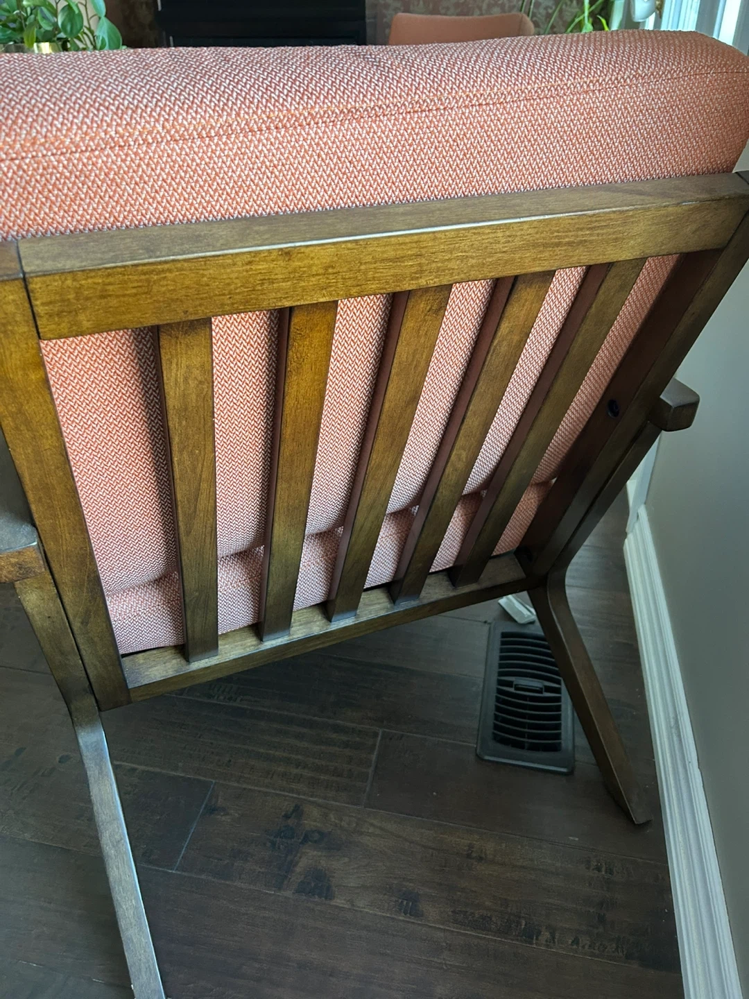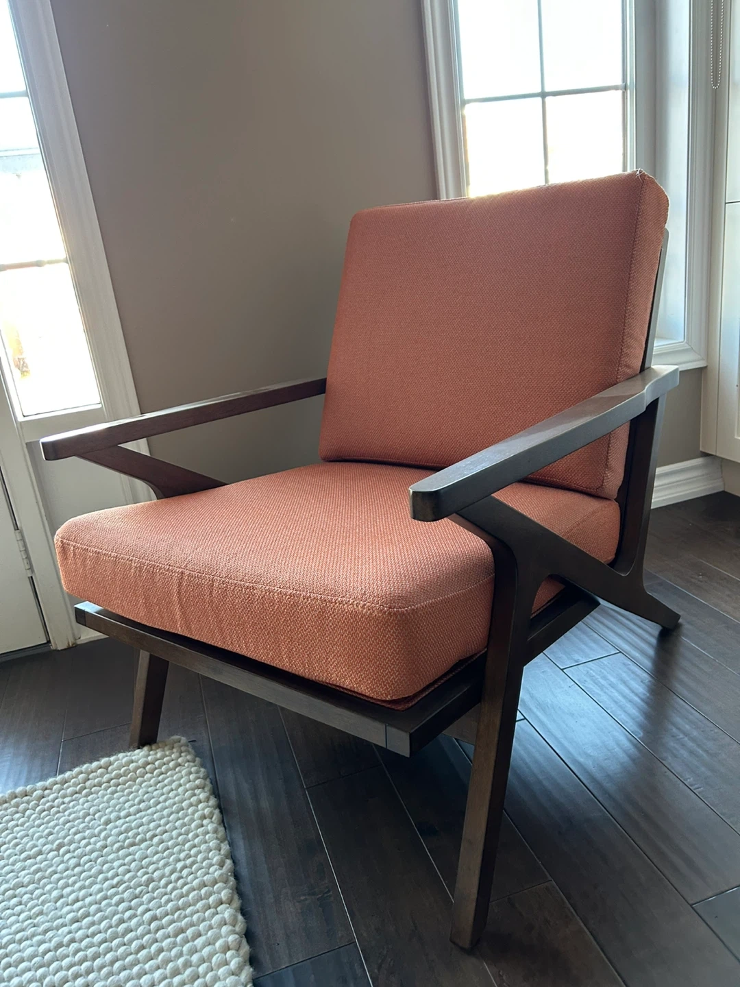 10200 each . Selling a stylish mid-century modern armchair! It has a unique design with a sturdy wooden frame and comfortable orange fabric cushions. There is a small stain on the cushion as pictured.