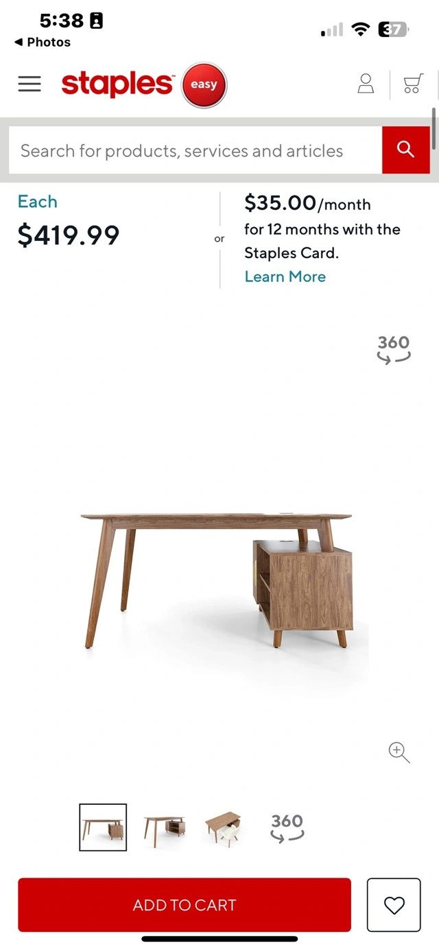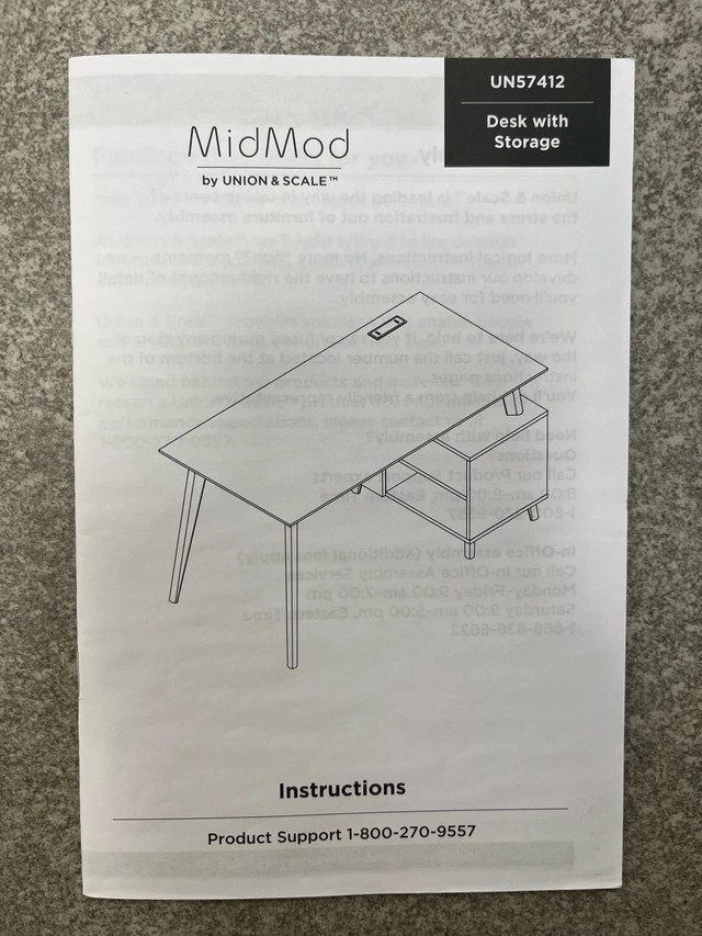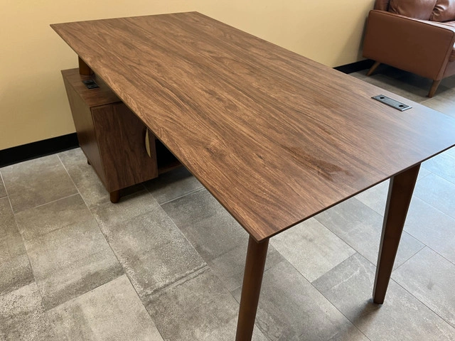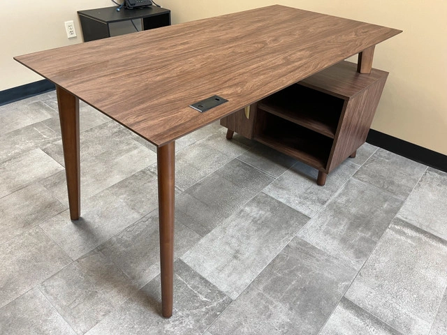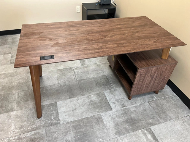 91Stylish mid-century modern desk with a sleek walnut finish. Dimensions are 29.5"H x 59.7"W x 29.4"D. It features a built-in power outlet and USB ports, along with open shelving for storage. It has some signs of wear and tear but remains in good condition and is a sturdy workstation.