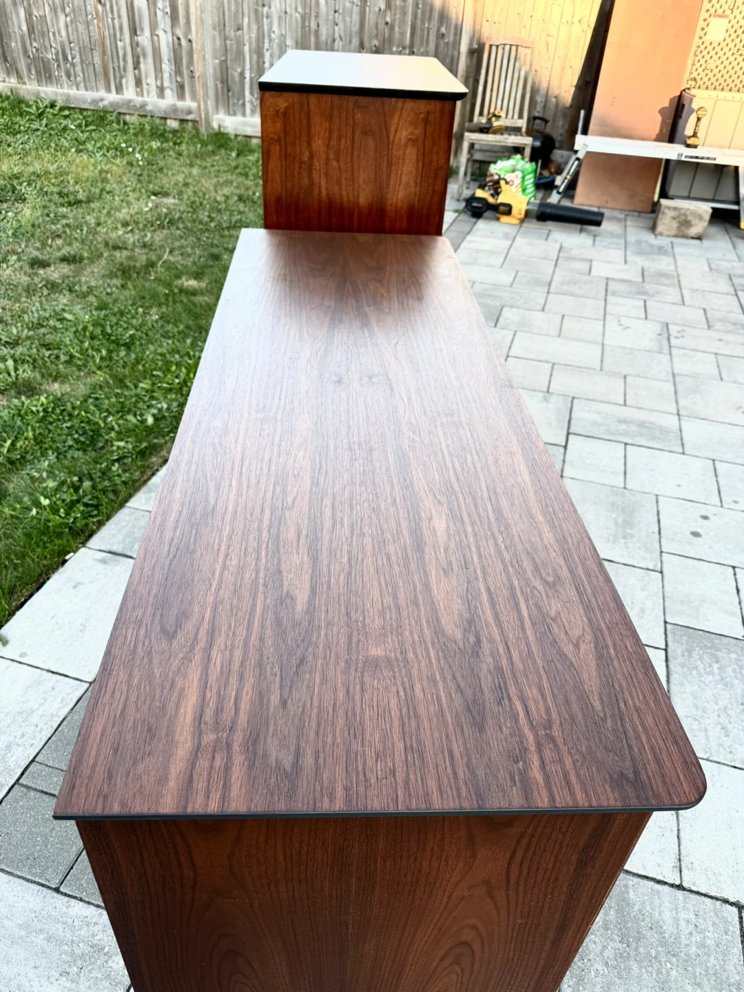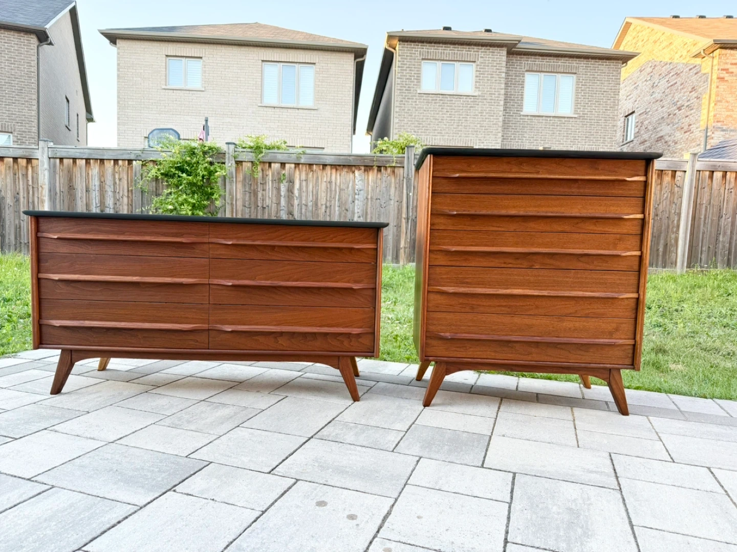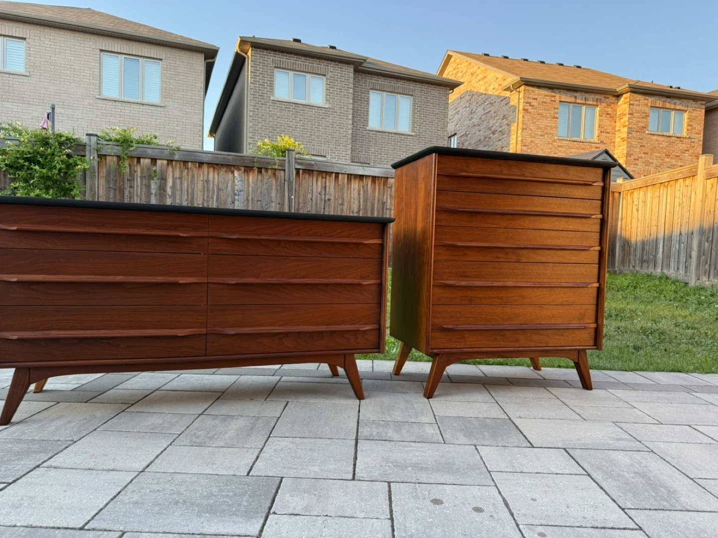 Selling a beautiful mid-century modern dresser set. The set includes a long dresser and a tall dresser, both in a lovely walnut finish. Perfect for adding a touch of retro style to your bedroom! Fully Restored