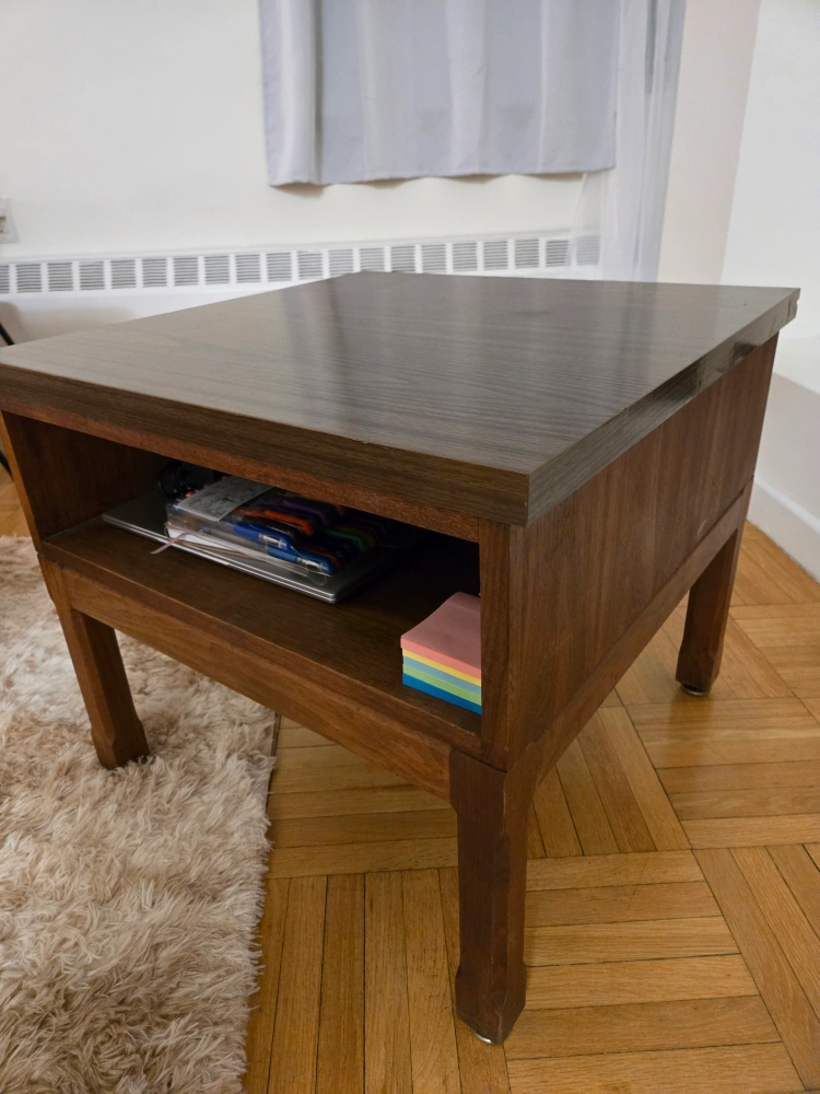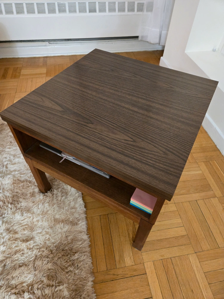 41Small end table with a shelf, dark wood laminate finish. Legs are square with rounded corners.