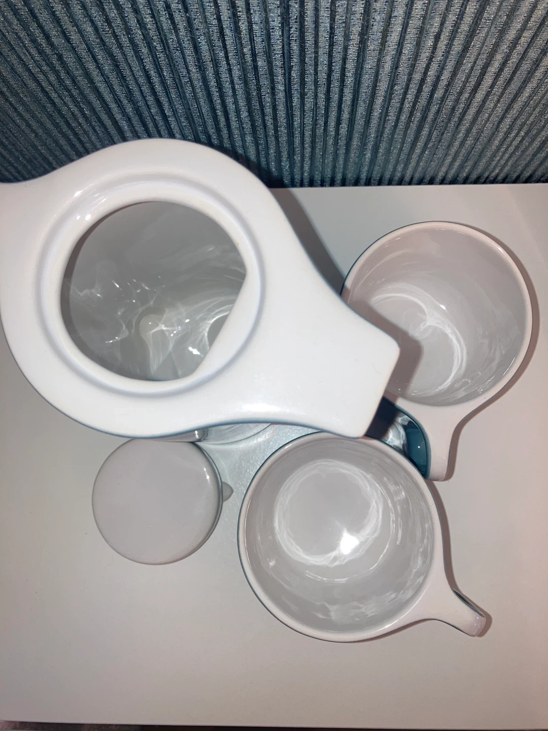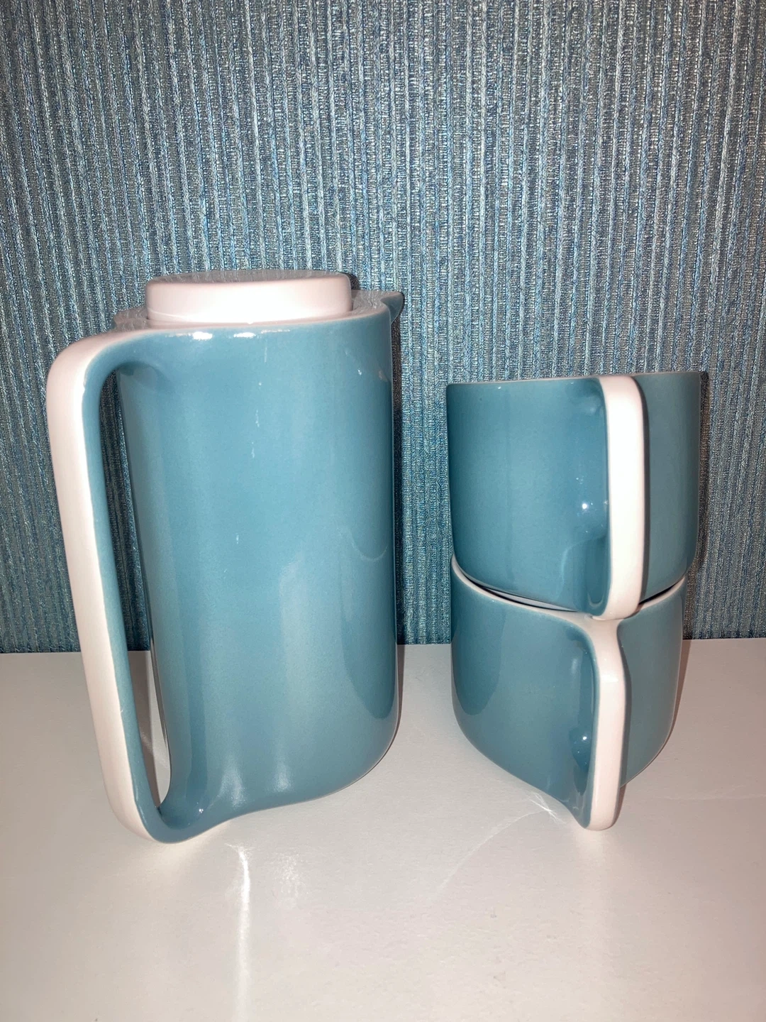Selling a lovely vintage inspired mid century modern coffee/tea/ pot with two matching cups. Perfect for adding a touch of retro charm to your kitchen or coffee station! Elegant teal ceramic coffee set with a pot and two mugs. Perfect for serving hot beverages. Inspired in the retro style of Homer Laughlin China Company of 1963. Mid Century Modern, Retro, Vintage MCM
