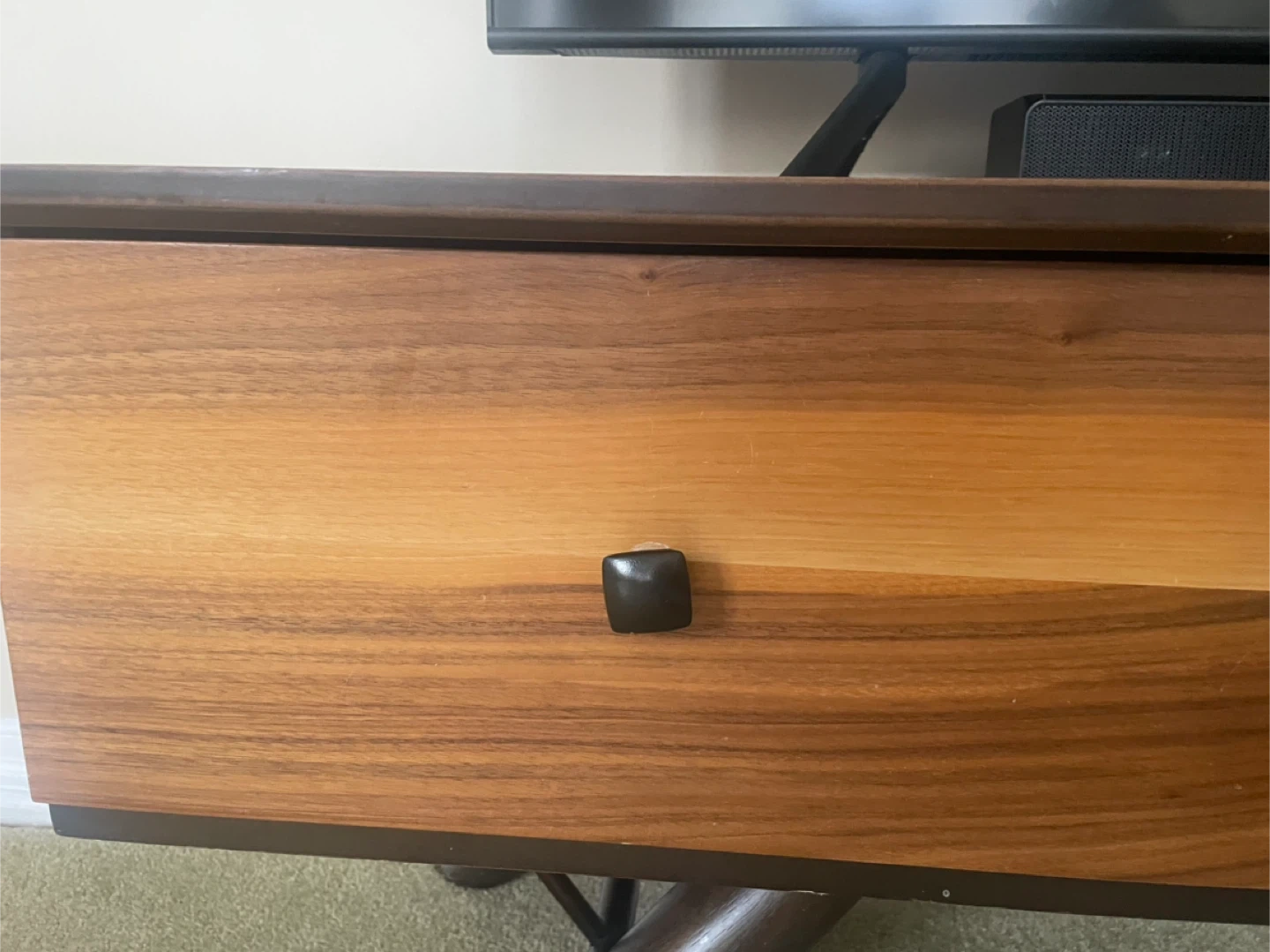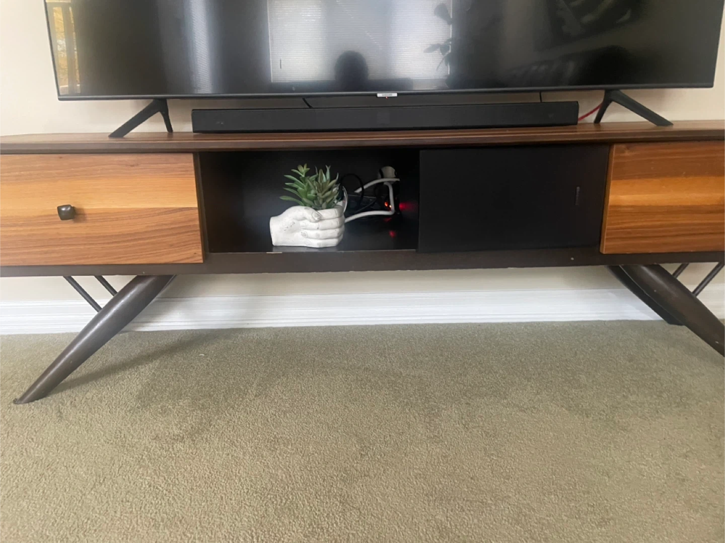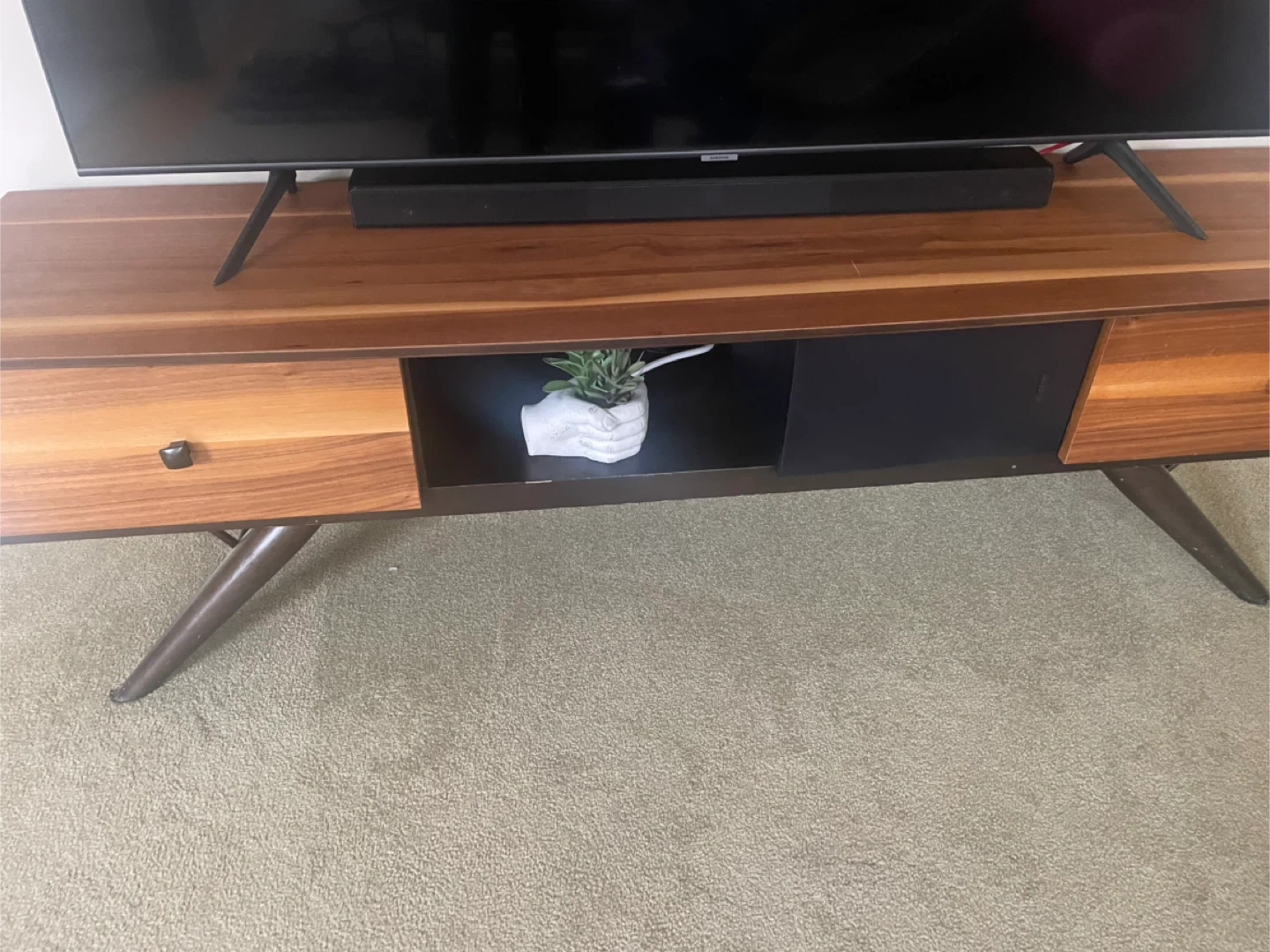 20Selling a stylish TV stand with a mid-century modern design. It features a combination of wood tones and a sleek silhouette. It has drawers and a cabinet for storage. Perfect for adding a touch of retro charm to your living room!