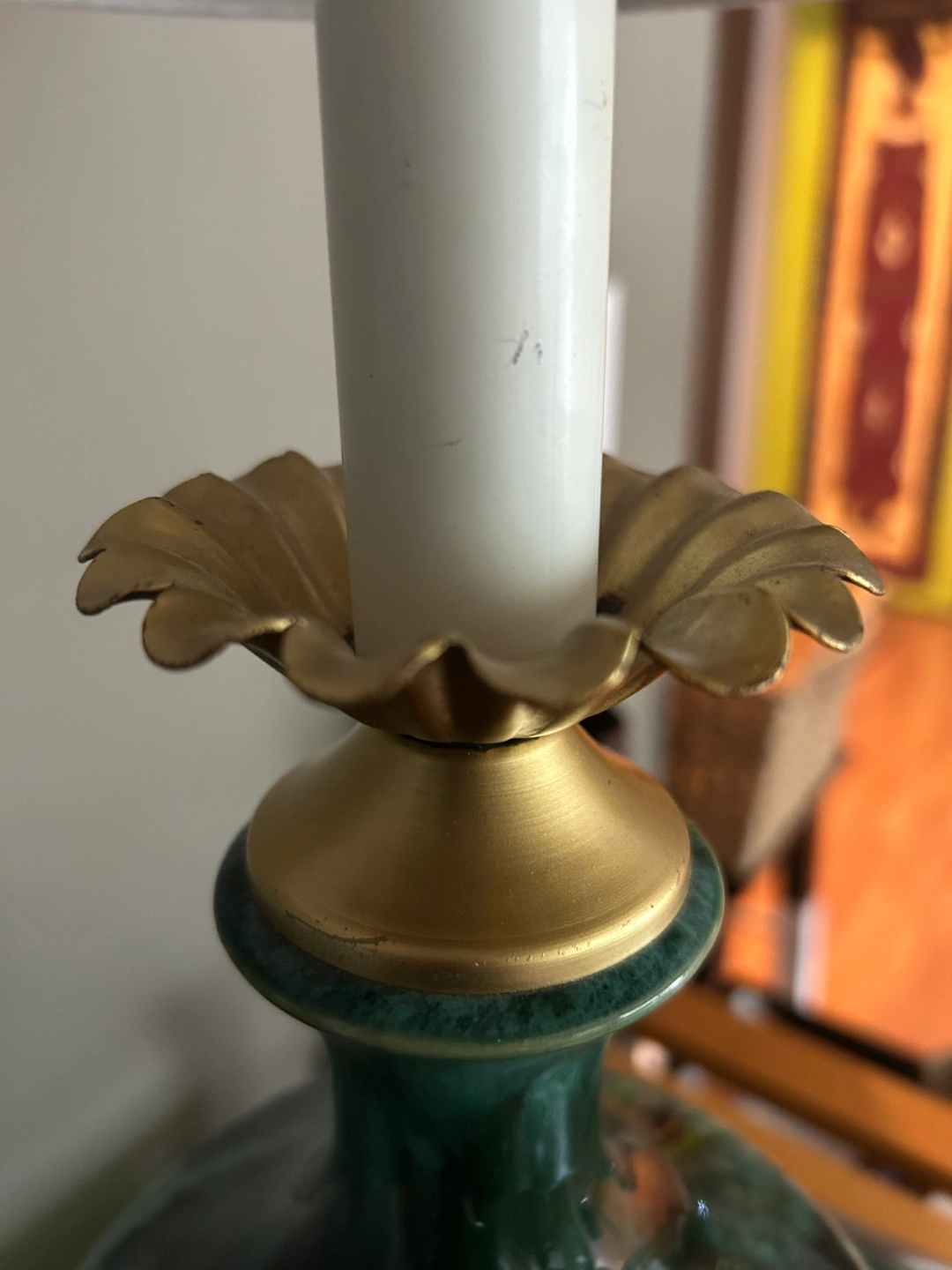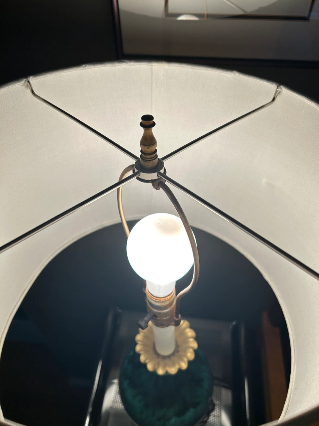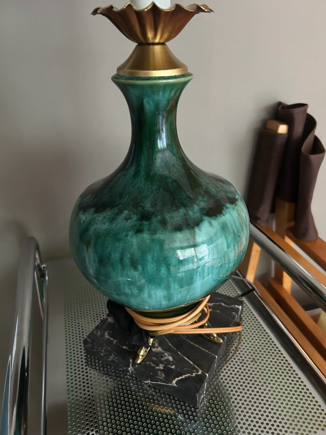 5Beautiful vintage table lamp. Features a JADE GREEN ceramic base and gold-toned brass accents. Off-white lampshade included. Black marble base. BULB ALSO INCLUDED :) 27 inches tall (to top of shade). 14 inches diameter (across shade). Thanks for reading :)