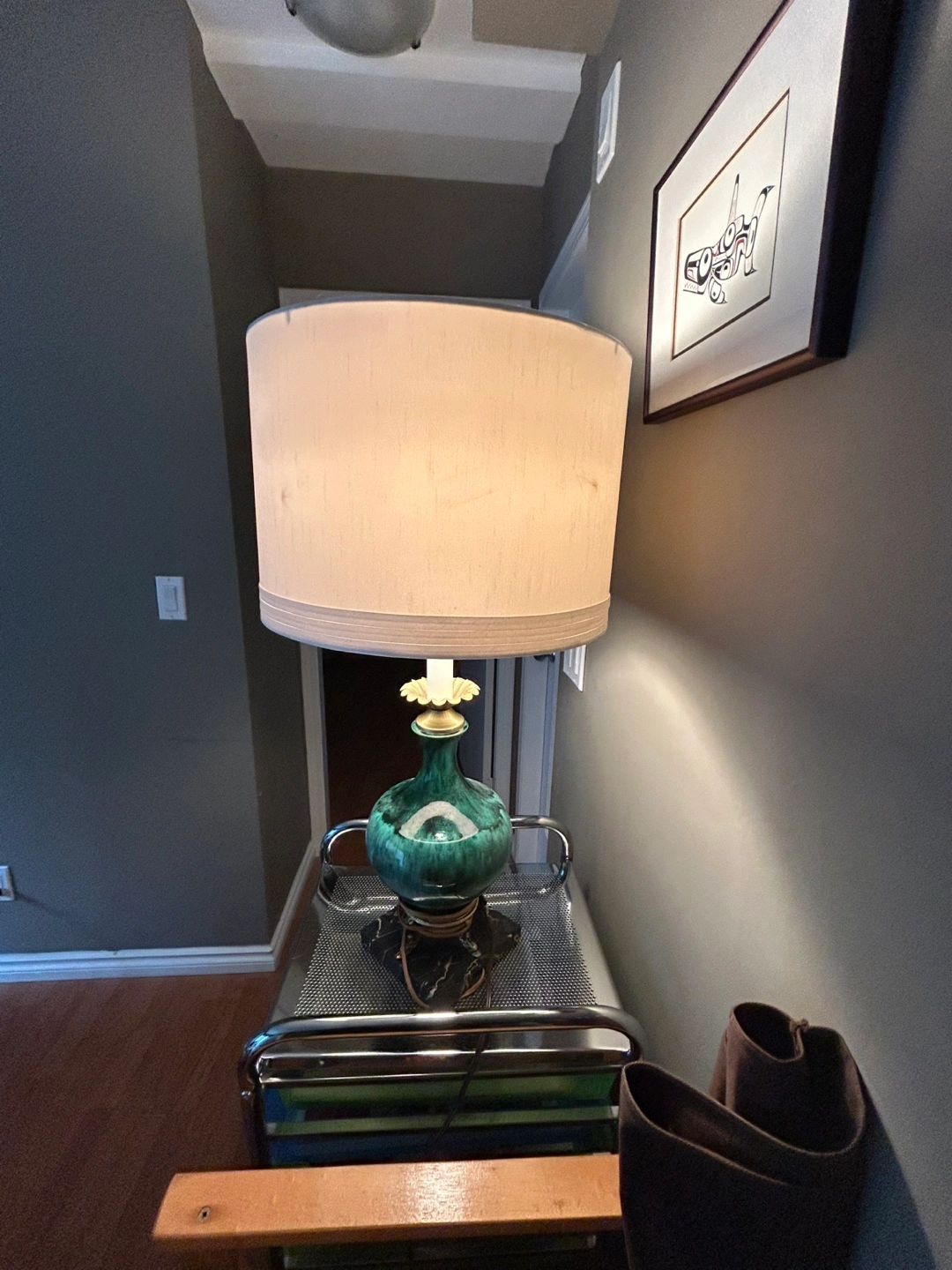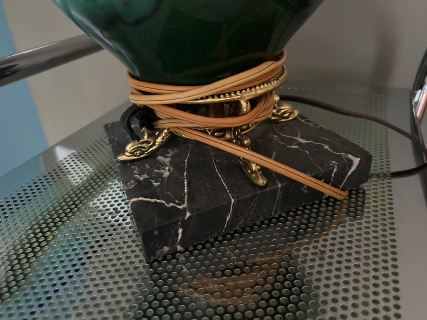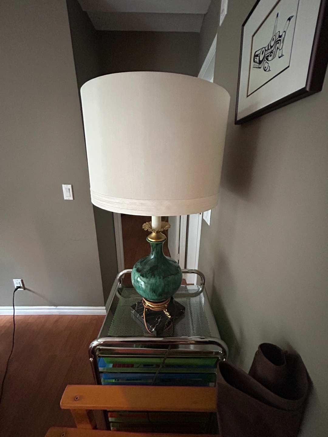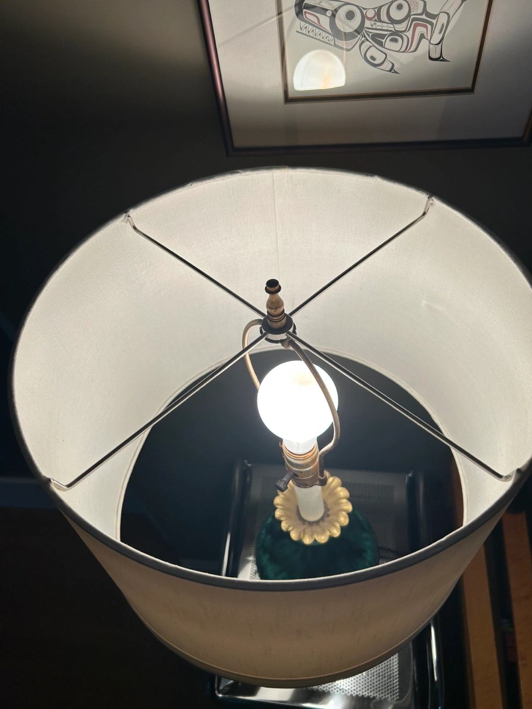 5Beautiful vintage table lamp. Features a JADE GREEN ceramic base and gold-toned brass accents. Off-white lampshade included. Black marble base. BULB ALSO INCLUDED :) 27 inches tall (to top of shade). 14 inches diameter (across shade). Thanks for reading :)