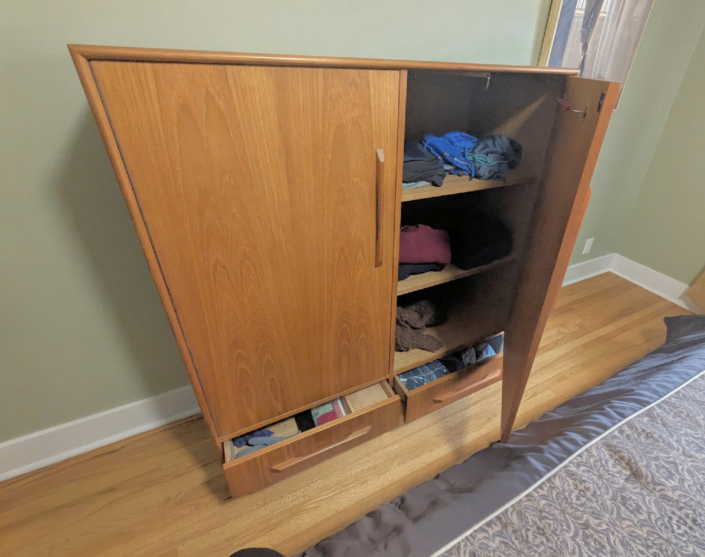 Selling a lovely teak wood wardrobe cabinet. It's in great shape and will easily add storage of clothes or other items to your space - both interior sides of armoire are identical for shelving. Unit measures 52.5"H x 46"W x 18"D