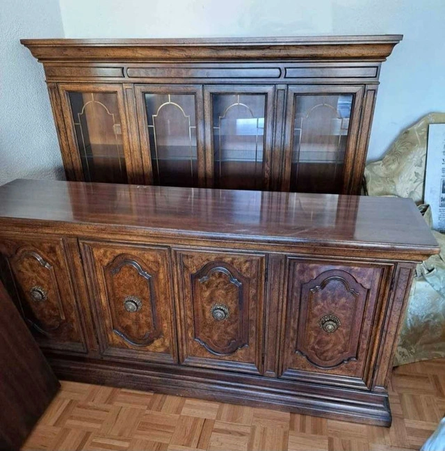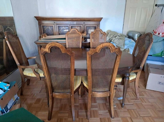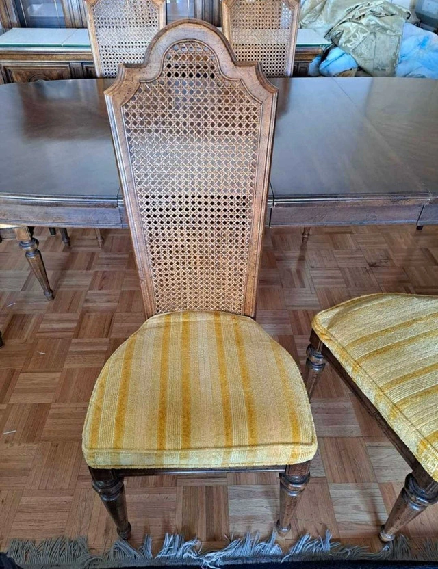 1950's -1960's Beautiful and rare vintage dining set from the iconic American of Martinsville. This mid-century walnut set features timeless craftsmanship and clean, sculptural lines that define the era. Includes: Extendable walnut dining table with rich wood grain Matching dining chairs with sleek tapered legs (original upholstery) Matching buffet/sideboard Condition: Immaculate Perfect for modern, vintage, or retro-inspired interiors. A collector’s piece that brings style and history to your home. Immaculate Condition More Info: Vintage, Antiques