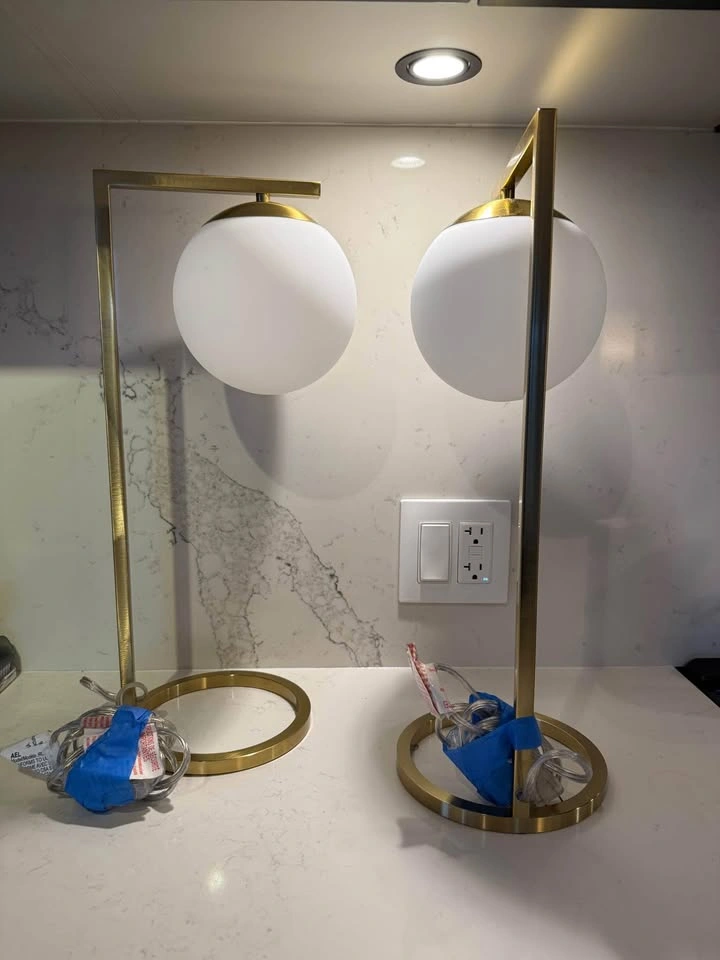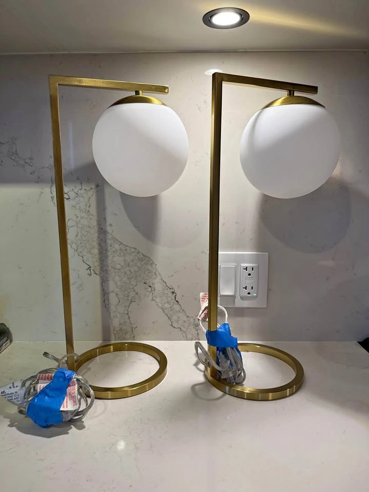 Midcentury modern beside lamps. Frosted glass, adjustable dimmer dial, gold tone metal base. Really nice, I’m just redecorating.
