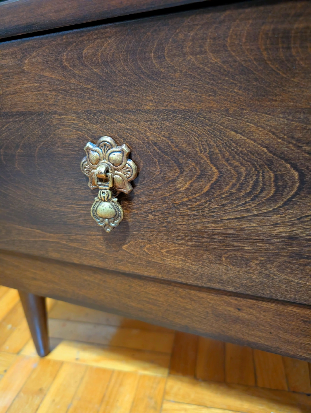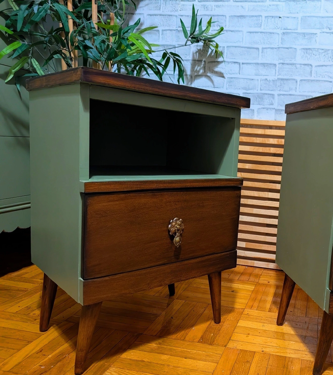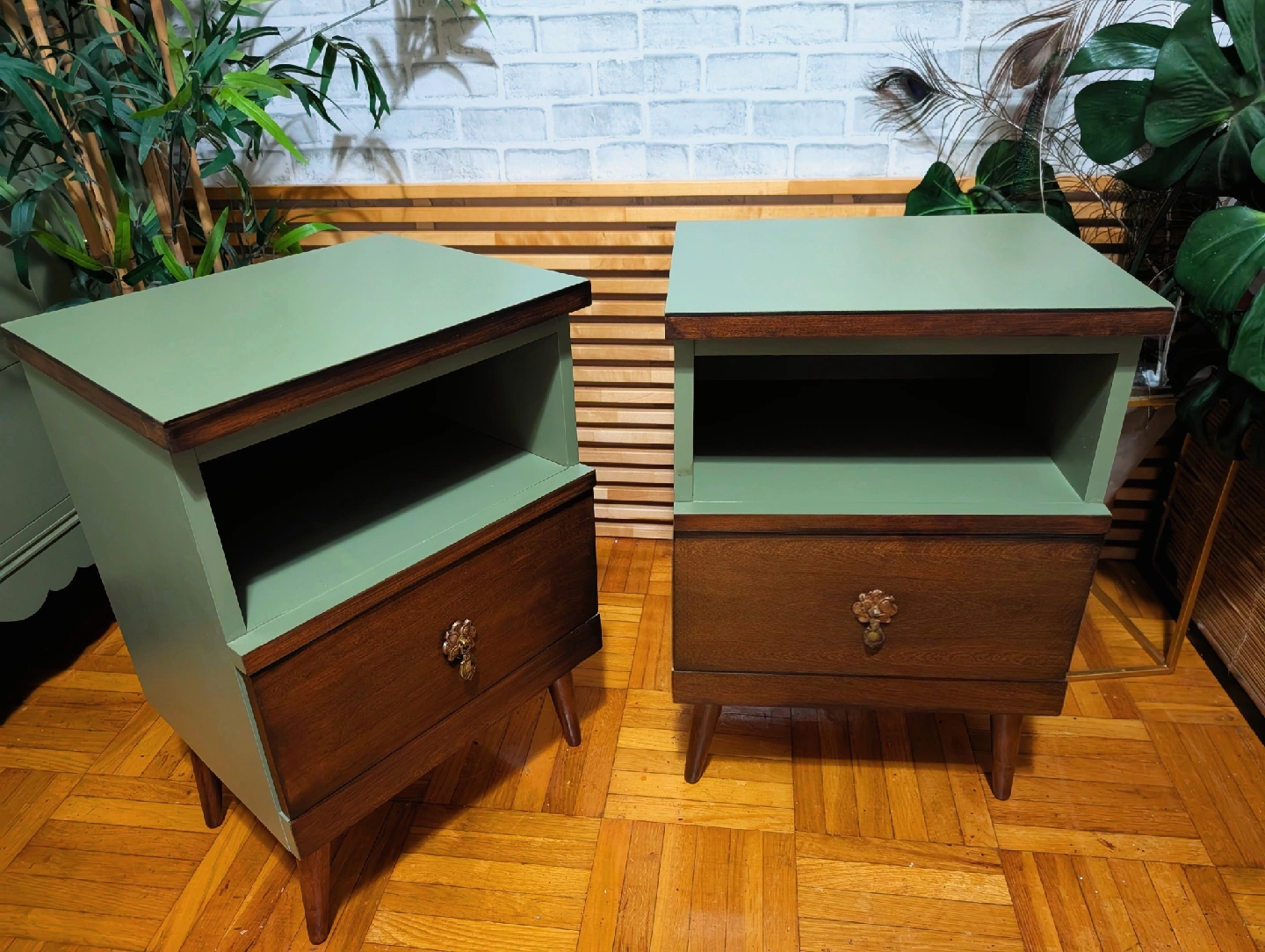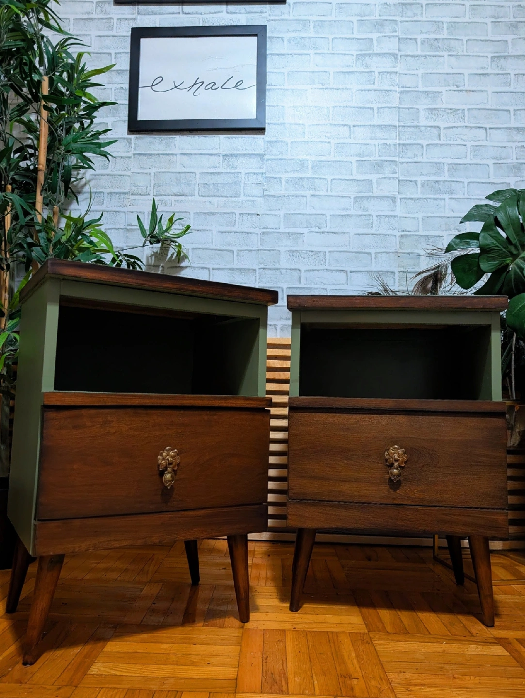 MCM Nightstands restored! Beautiful solid wood pieces with bare patterned wood drawers and earthy sage. Lots of storage and golden rare handles. Very rare and unique find. See makers mark. (Made 1960) The pictures pale in comparison to how beautiful these are. Measures: 24.75H x 16.75W x 13.75 D Delivery Cost = Location ๐ Loads more items posted. Asking if available / low offers will not be responded to.