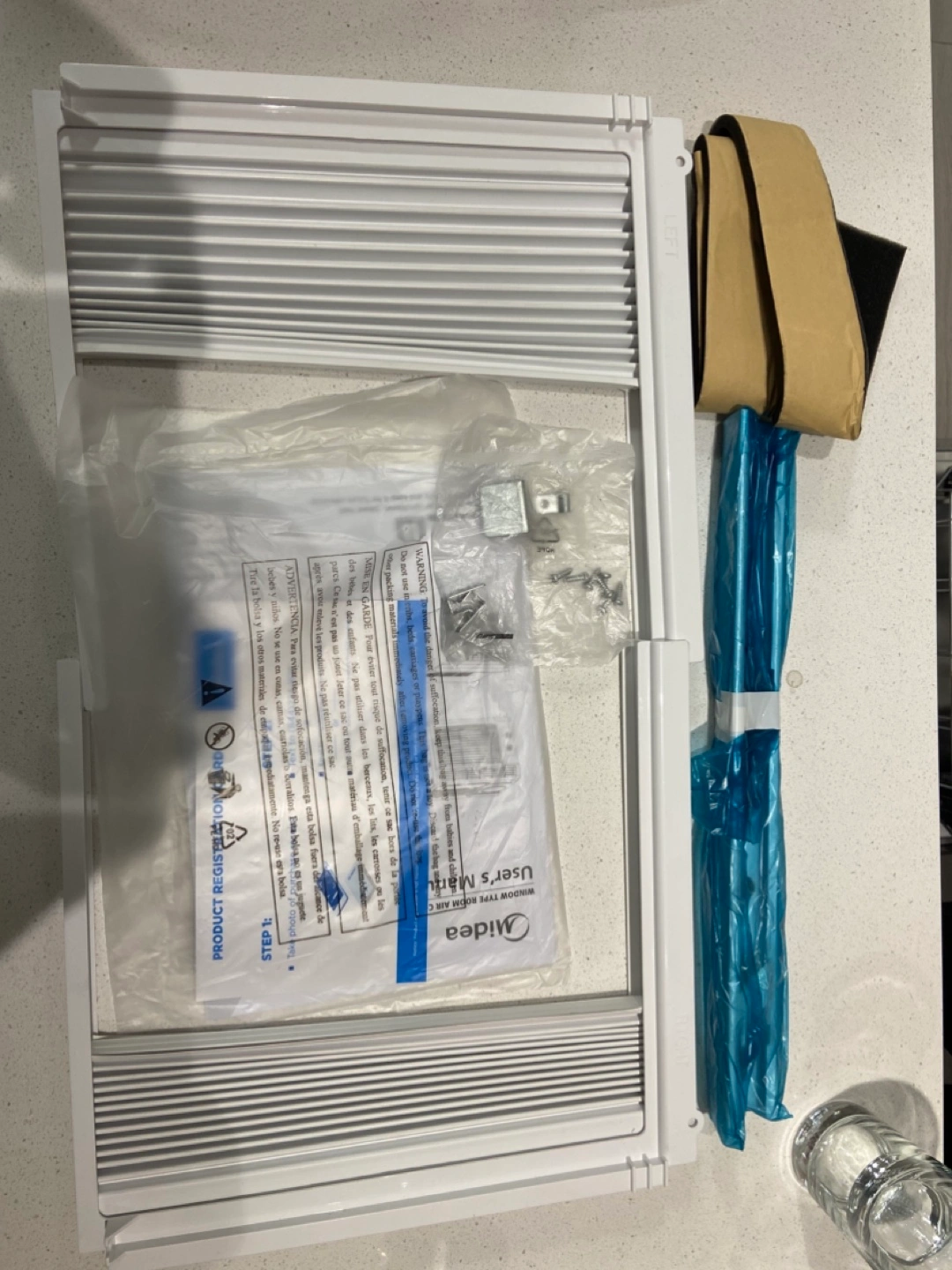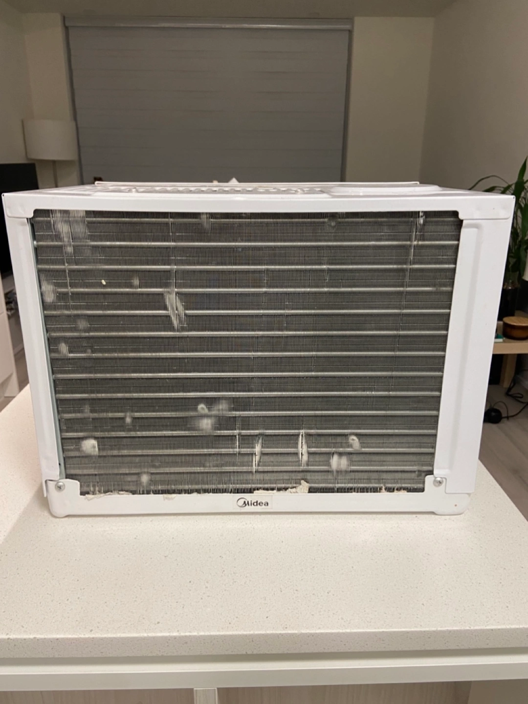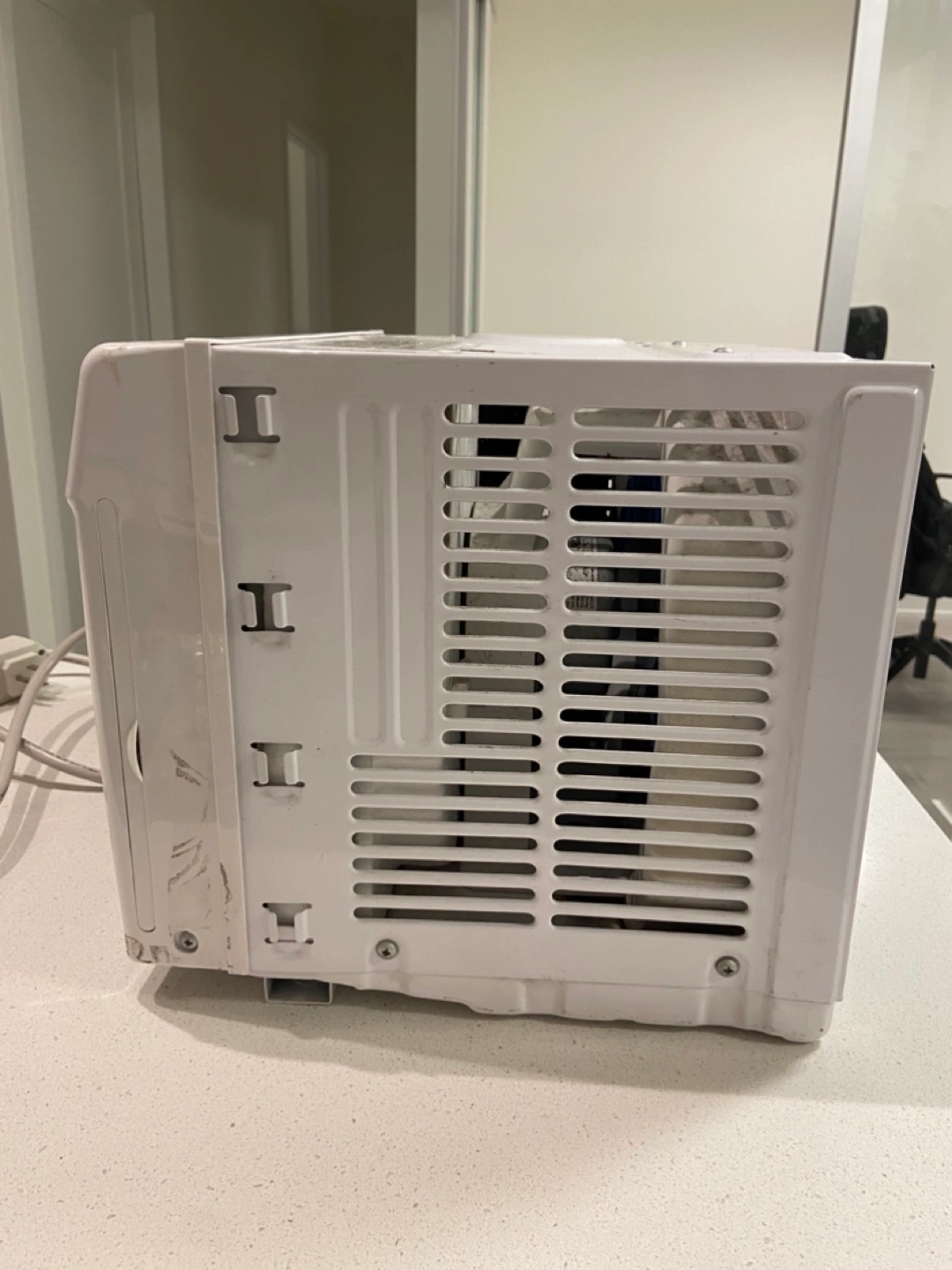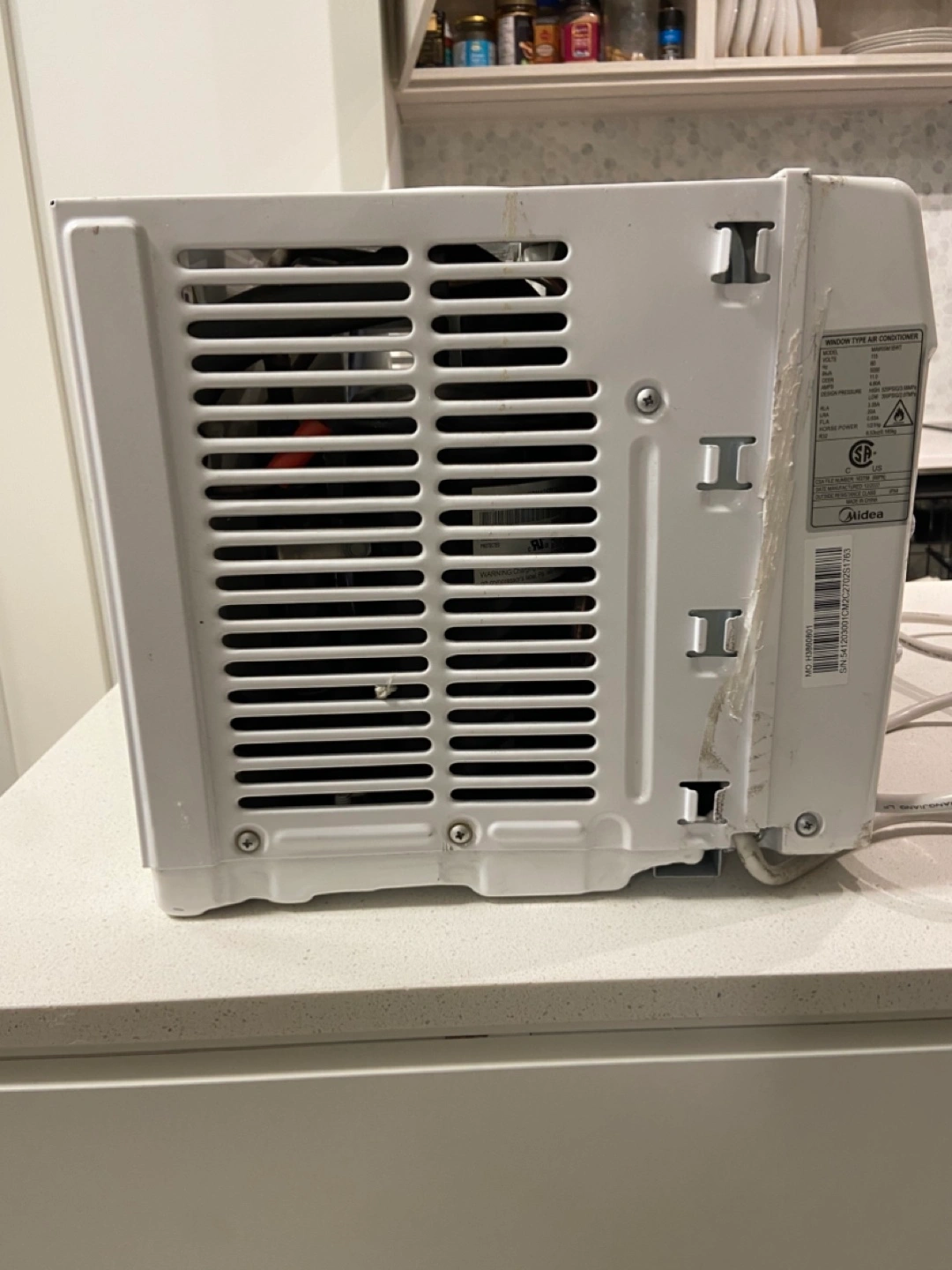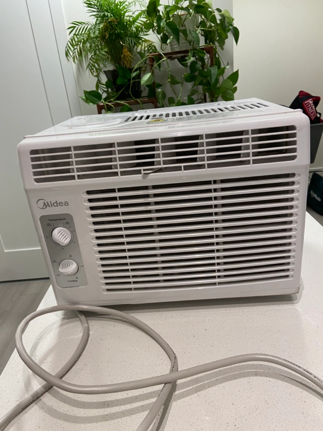 15Air conditioner, white. Features a front panel with controls for temperature and cooling. Grille at the back. Includes window installation kit. Perfect for a good night's sleep on those sweltering summer nights.