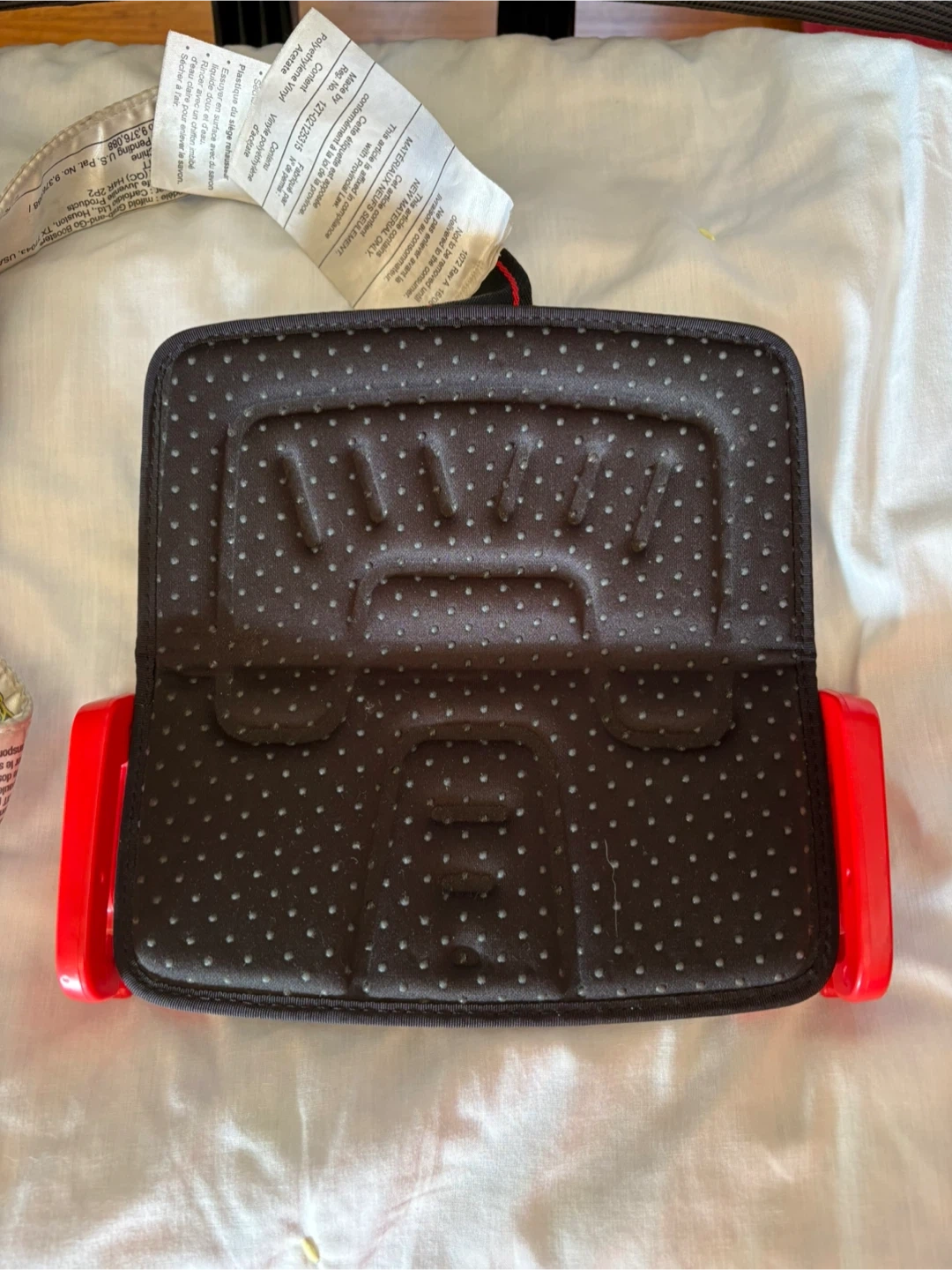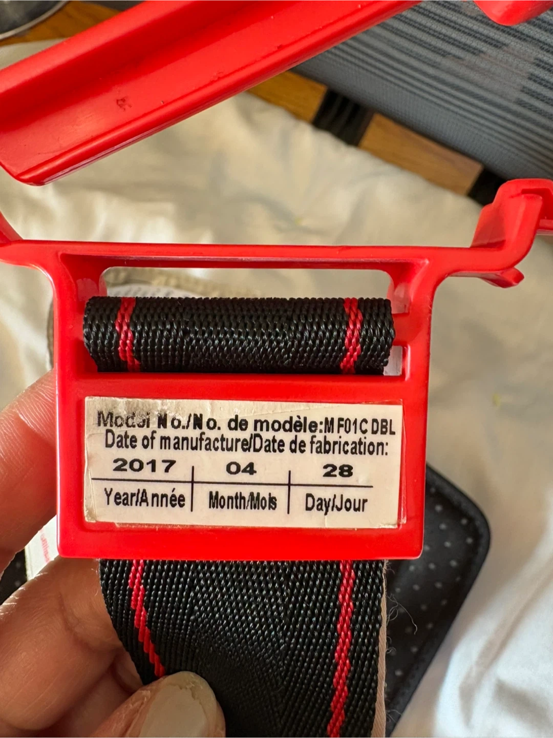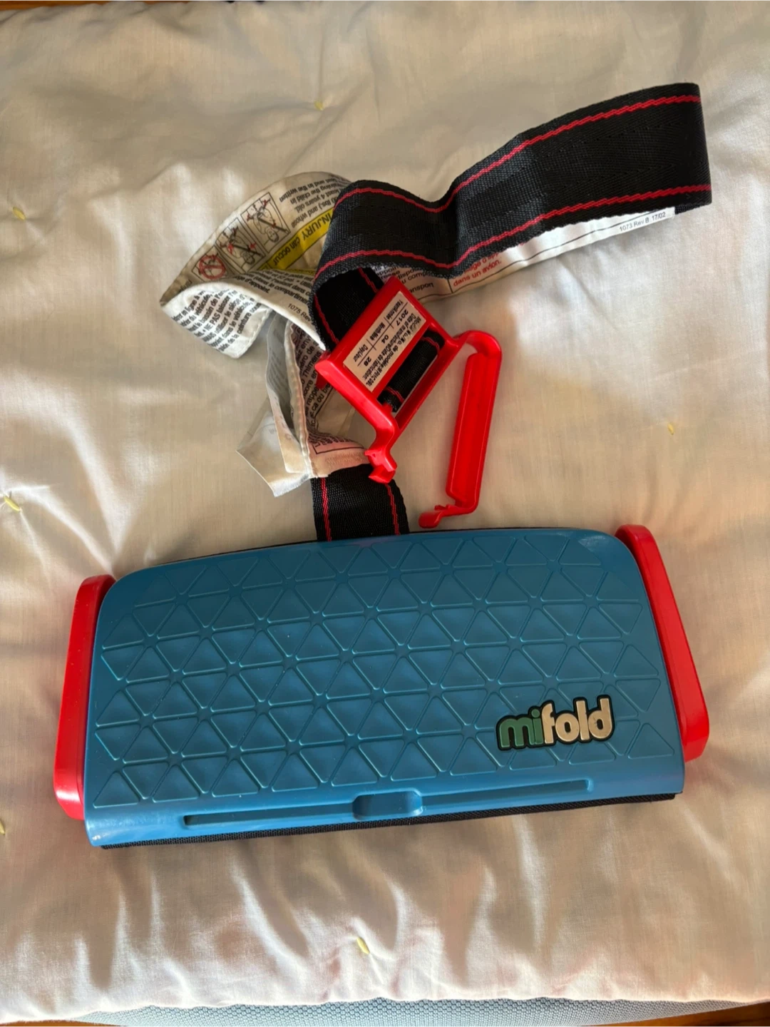 70Looking to sell my Mifold Grab-and-Go booster seat. It's super compact and portable, making it great for travel or carpooling. The booster seat features a blue base with red accents. Date of manufacture is 2017 April 28.