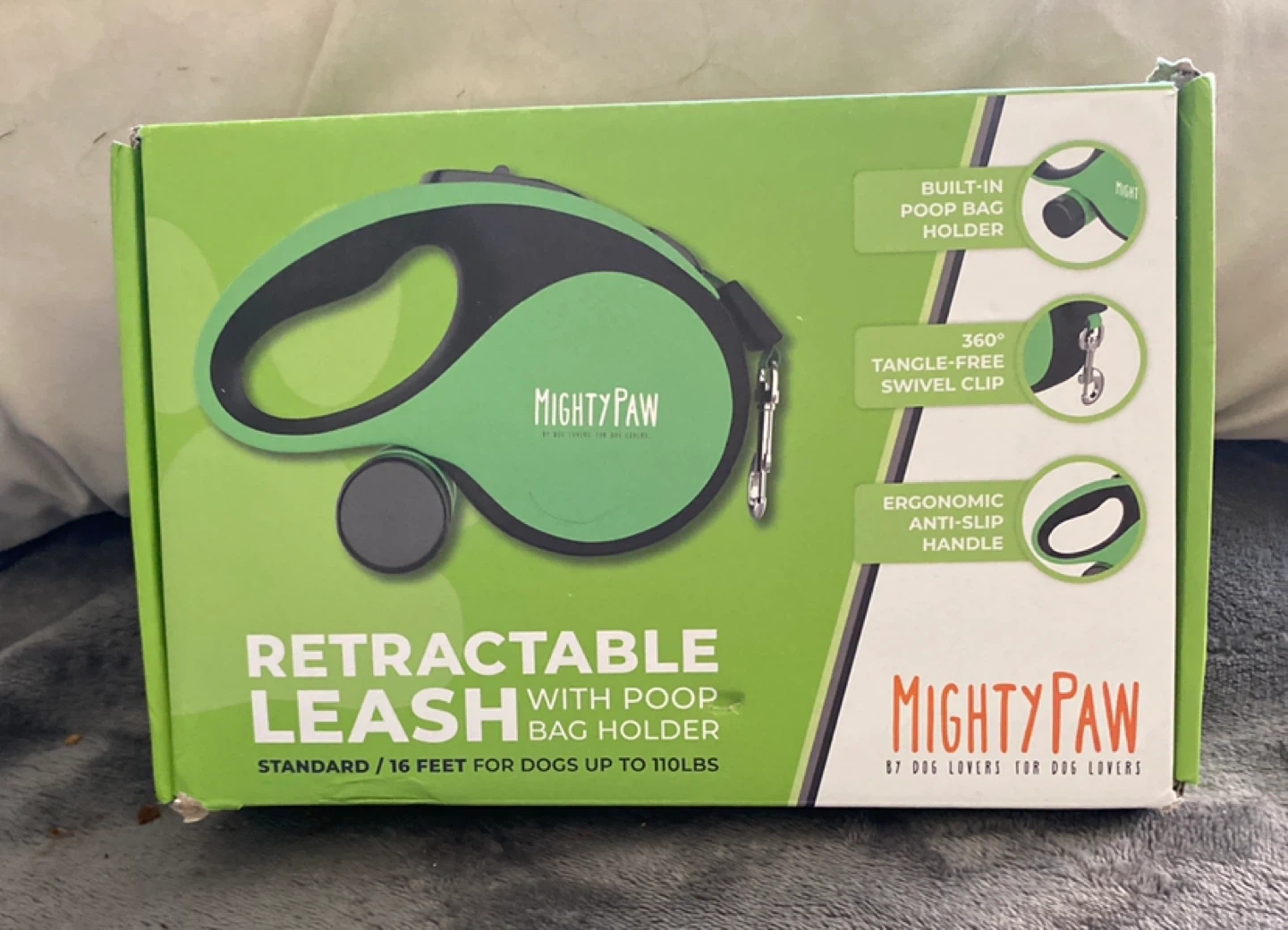 5Looking to sell a brand new Mighty Paw retractable leash! It's a standard size, extending to 16 feet, and is suitable for dogs up to 110lbs. It also features a built-in poop bag holder, tangle-free swivel clip, and ergonomic anti-slip handle. Great for dog lovers!