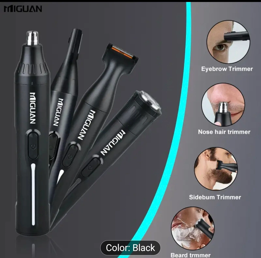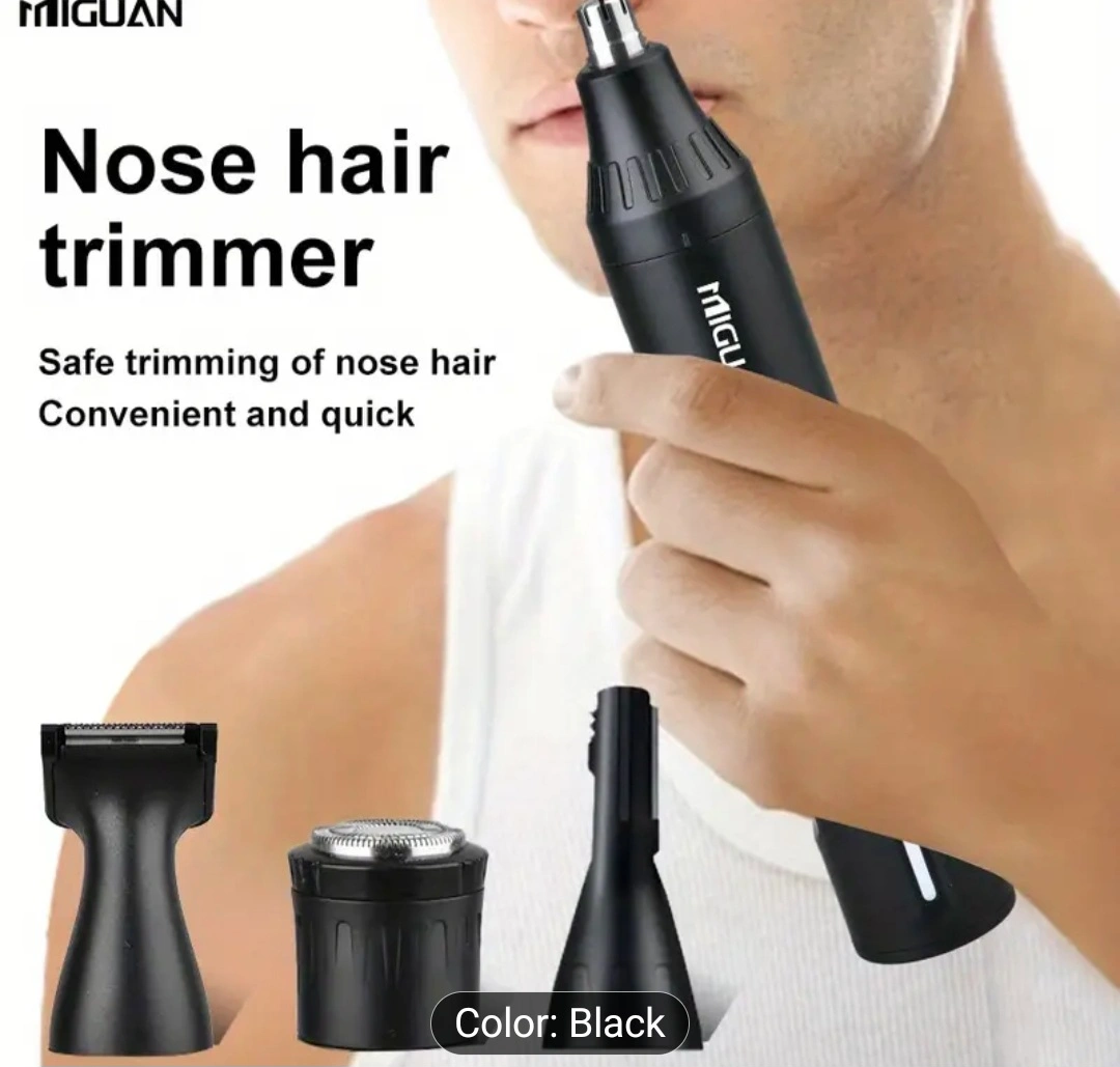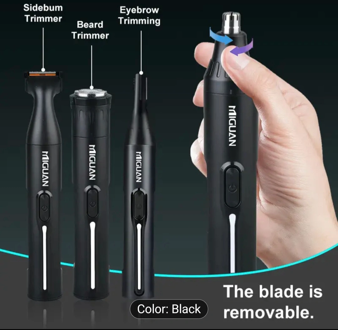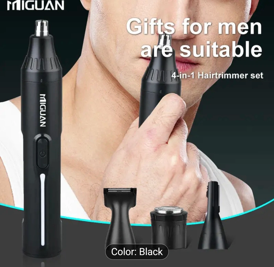 I'm selling a MIGUAN 4 in 1 multifunctional trimmer in black! It's a versatile grooming tool that includes attachments for: - Nose hair trimming - Eyebrow trimming - Sideburn trimming - Beard trimming The blade is removable for easy cleaning