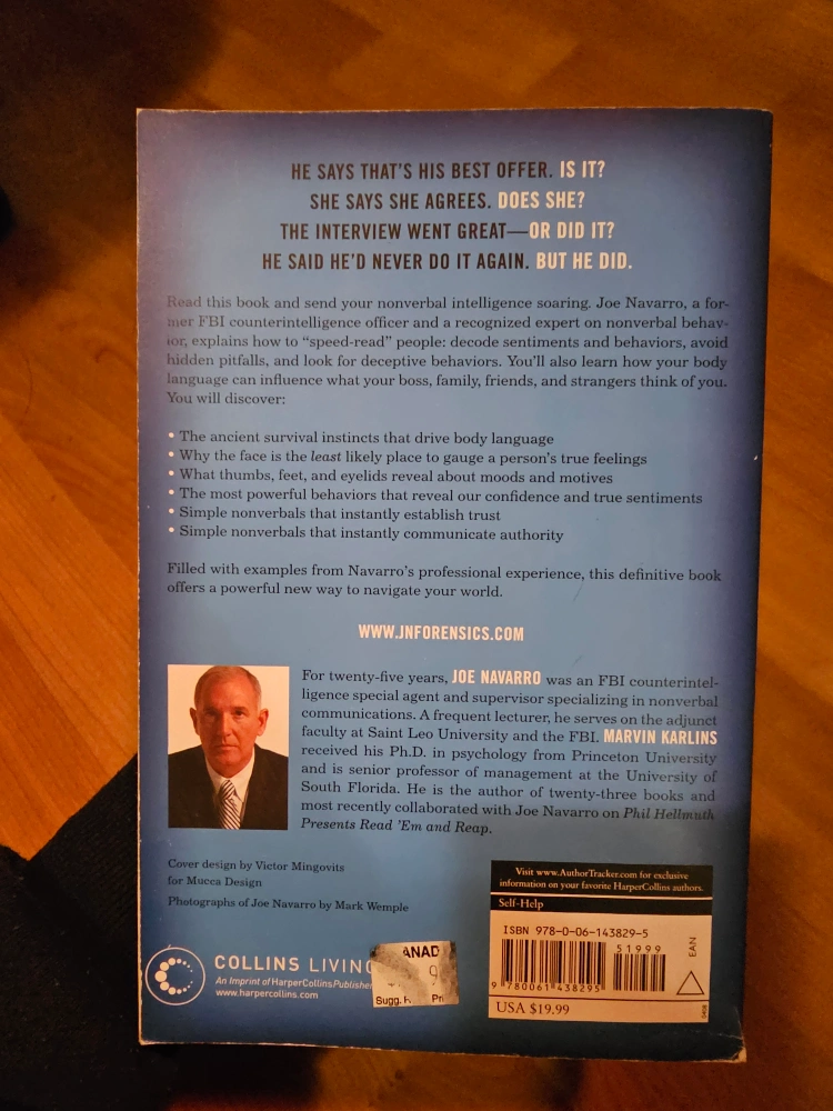 "Joe Navarro, a former FBI counterintelligence officer and a recognized expert on nonverbal behavior, explains how to "speed-read" people: decode sentiments and behaviors, avoid hidden pitfalls, and look for deceptive behaviors. You'll also learn how your body language can influence what your boss, family, friends, and strangers think of you."