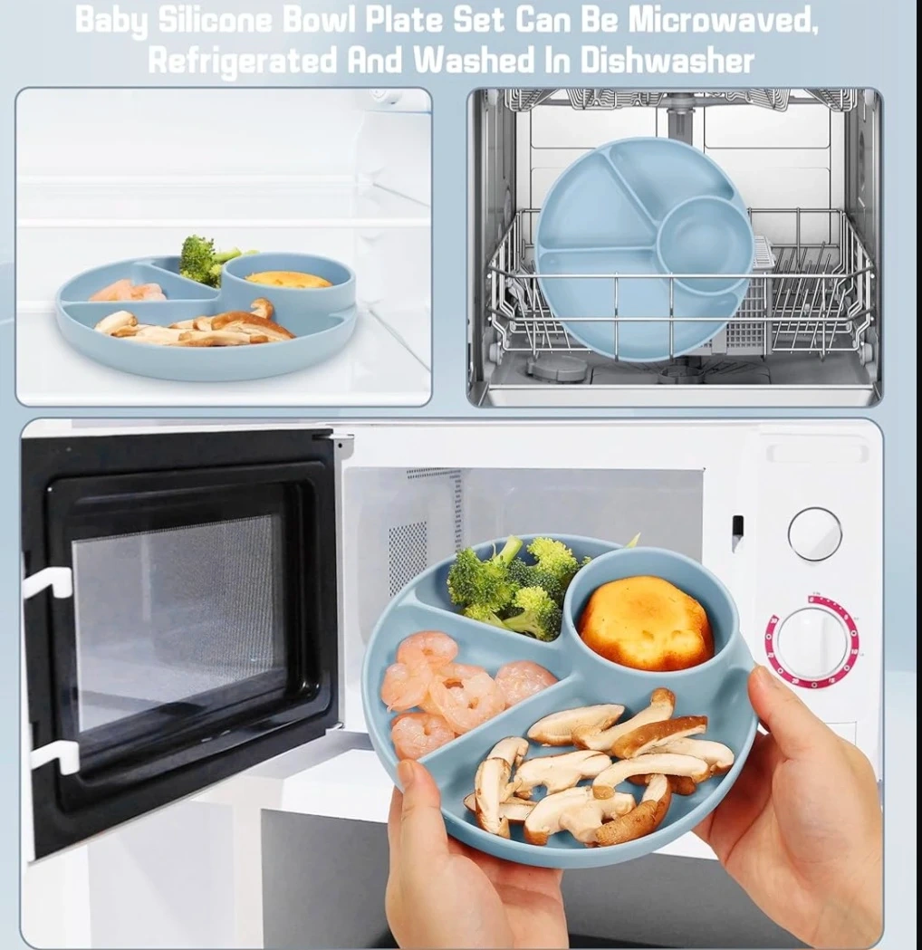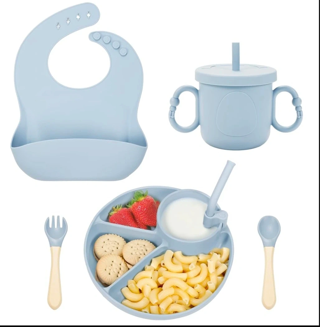 131This baby feeding set is perfect for starting solids! It includes a divided plate, adjustable bib, sippy cup with handles, fork, and spoon. The silicone material is food grade/BPA Free and safe for your little one. It's also microwave and dishwasher safe, making mealtime and cleanup a breeze! Great for refrigerator storage too -New, Open Box