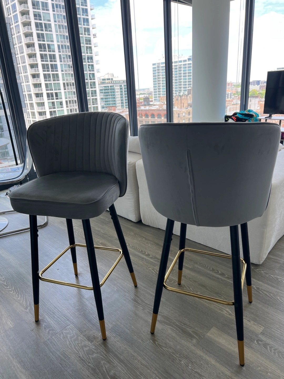Moving sale! Two grey velvet counter stools. Black legs and gold accents.