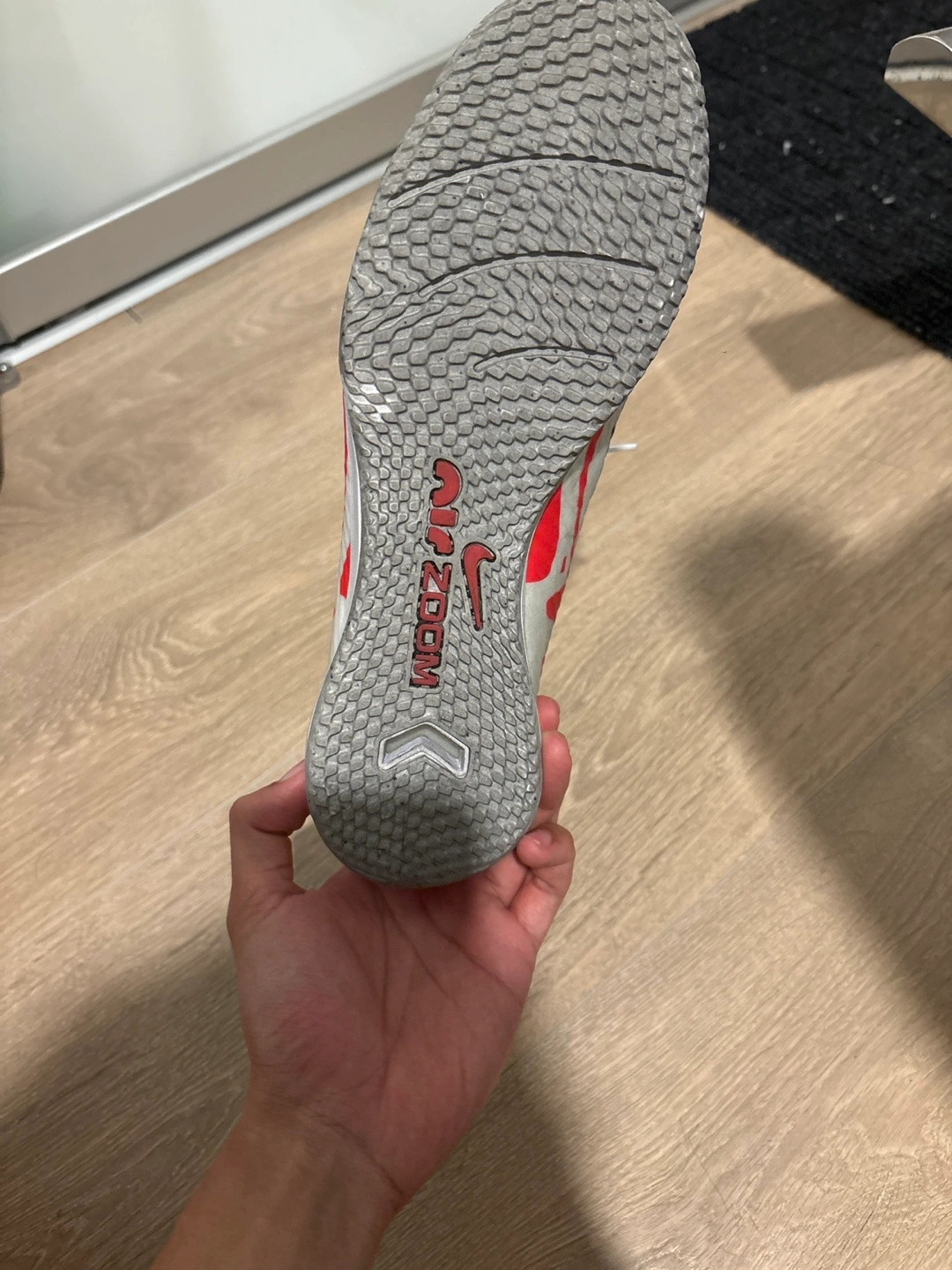 Indoor court soccer shoes. Grey and red colourway. Size not specified. Size 9.5 nike Airzoom