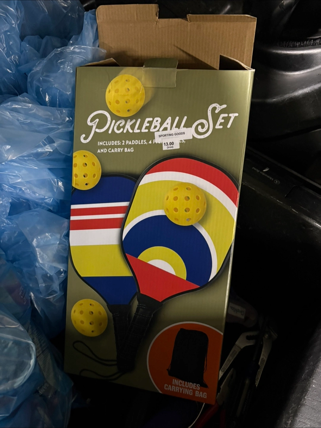 This is a pickleball set that includes 2 paddles, 4 pickleballs, and a carry bag. The paddles have colourful designs, and it's great for getting started with the sport!
