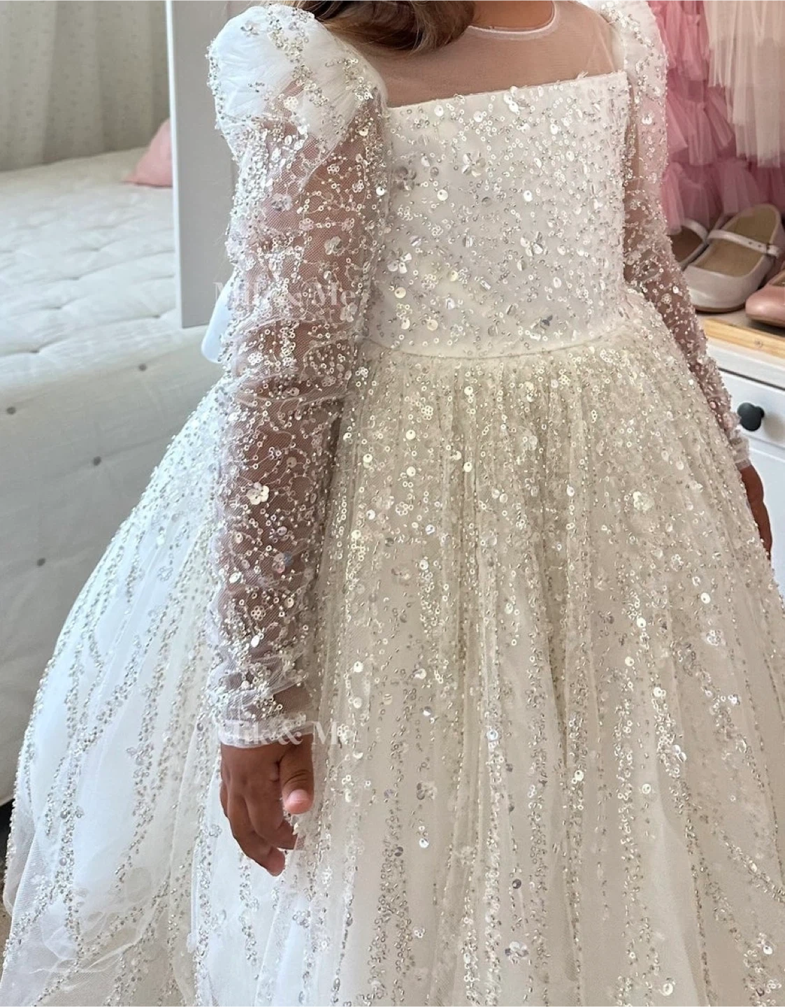 68Check out this beautiful girls' white dress from Mik & Me! It's covered in sequins and has a lovely bow in the back. Perfect for a special occasion!
