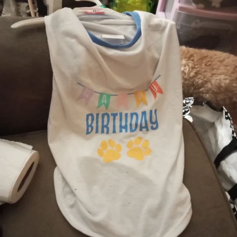 White dog t-shirt with "Happy Birthday" and paw print graphic