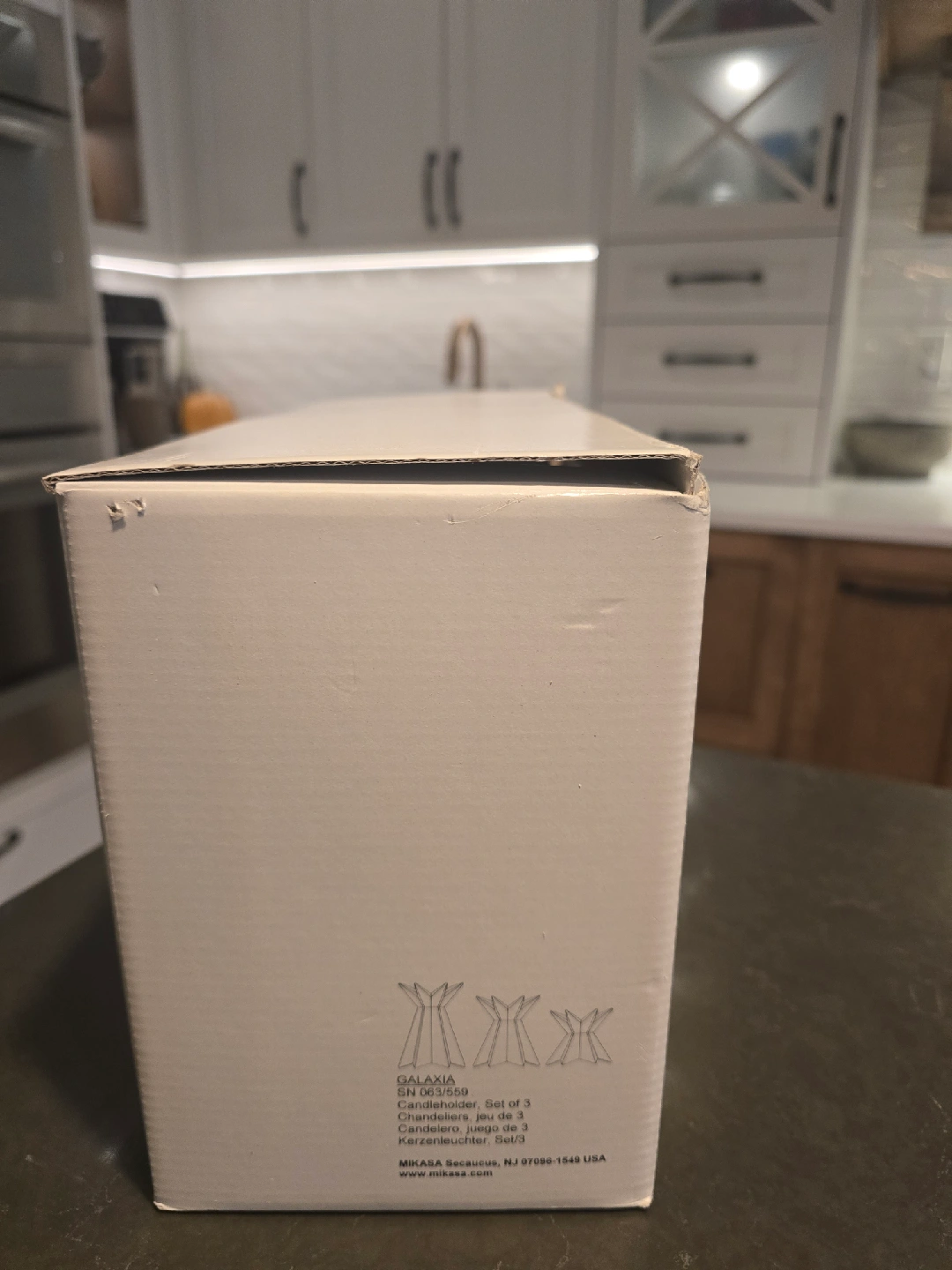 73Selling a brand new Mikasa Galaxia Chandelier candle holder Set of 3! It's still in its original box, ready to add a touch of sparkle to your home. Perfect for creating a warm and inviting atmosphere