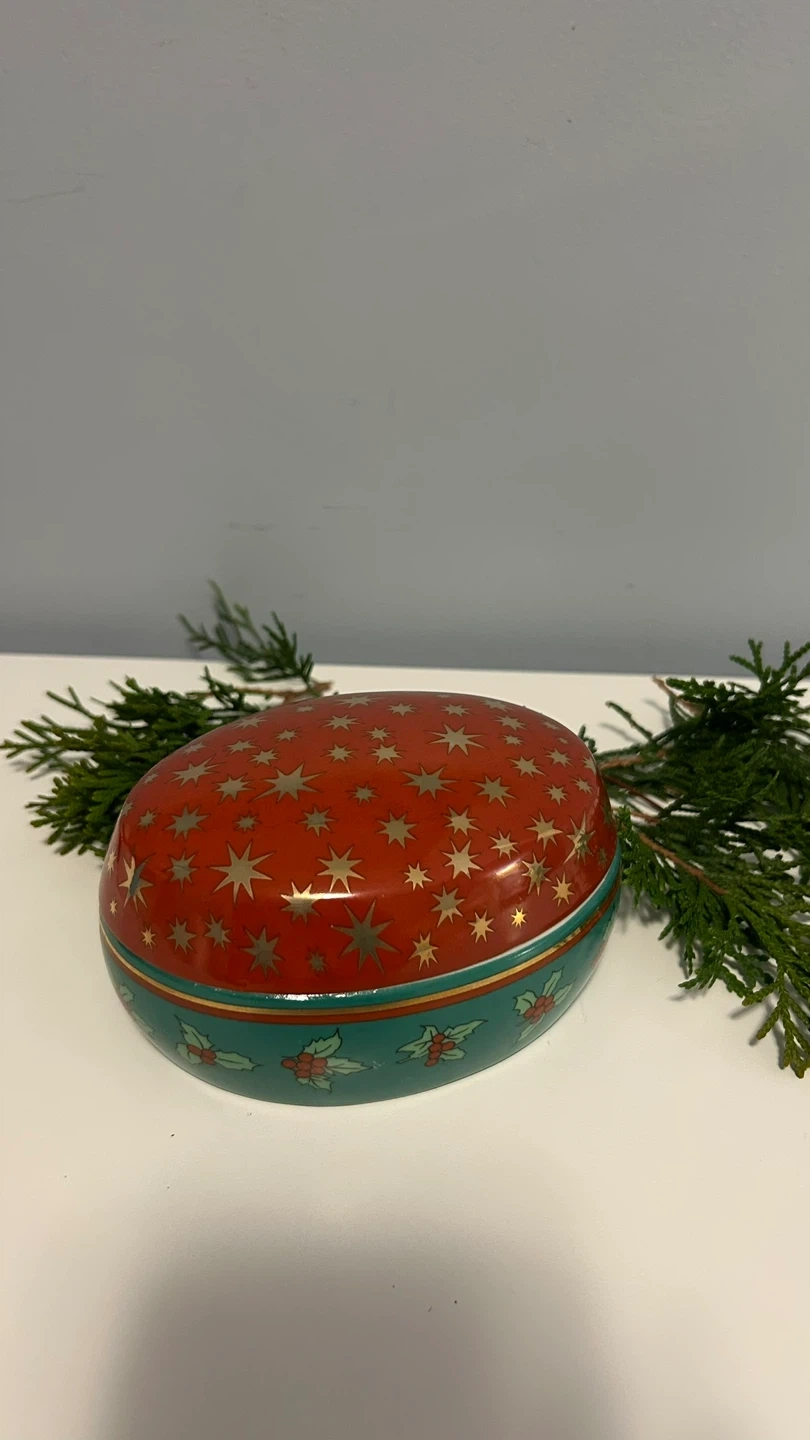 62This is a fine porcelain box from Mikasa's Holiday Elegance collection. It features a festive design with stars and holly. Perfect for storing small items or as a decorative piece during the holidays! Excellent condition. 5.5 “ diameter