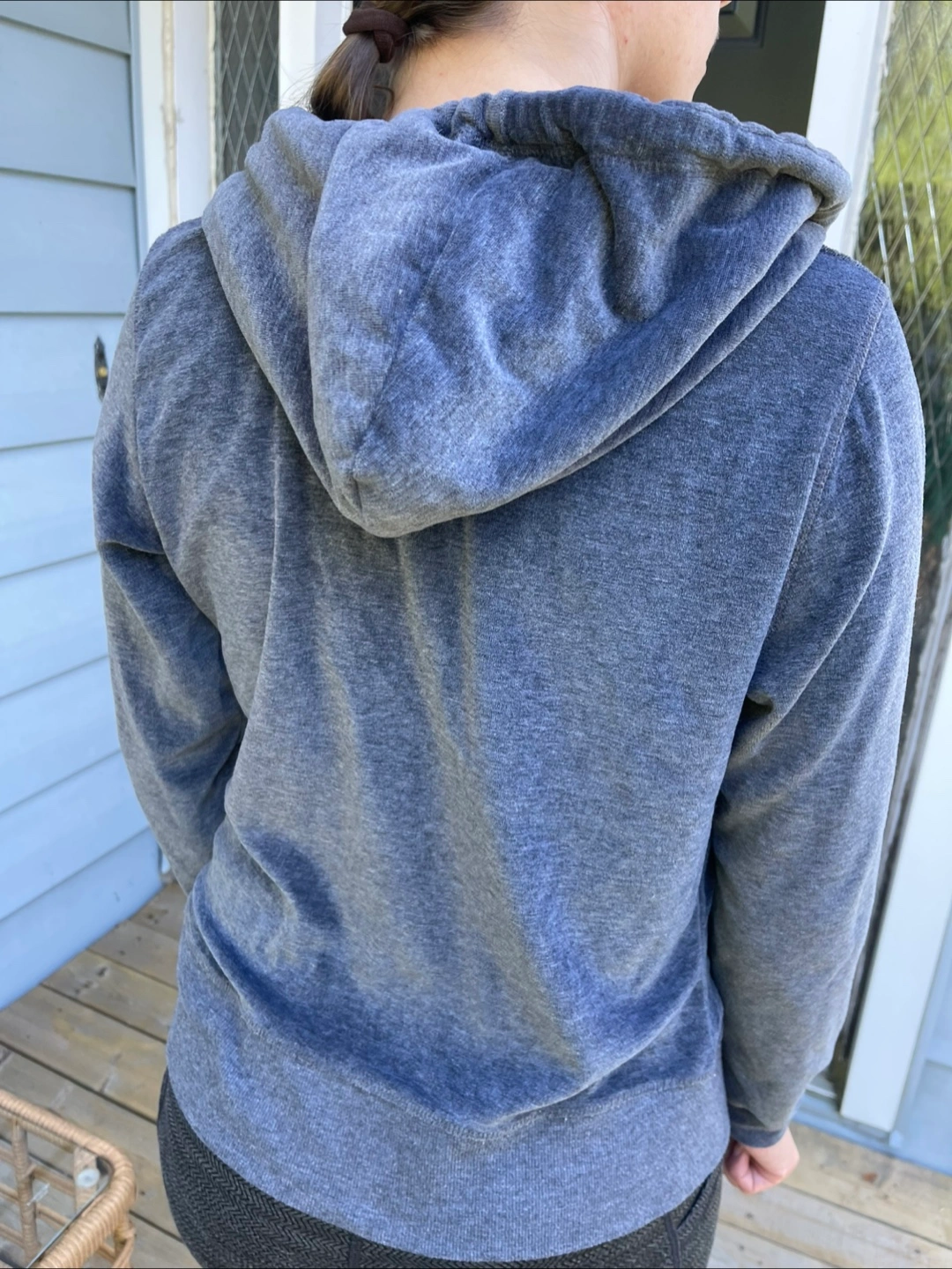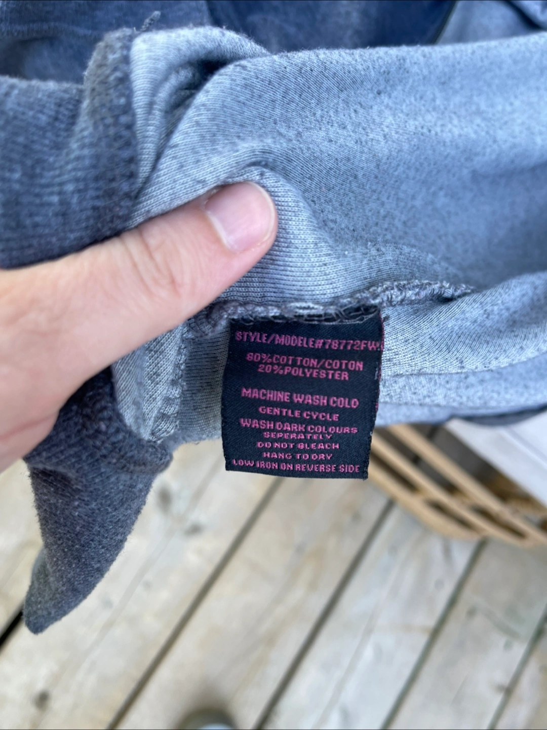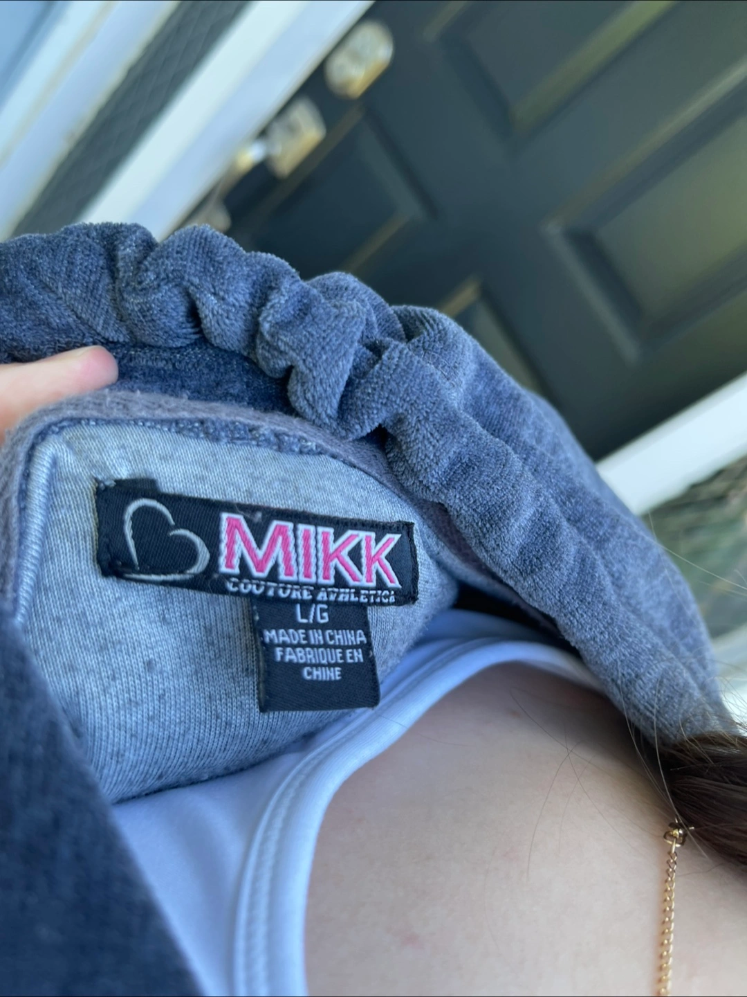 MIKK Couture Athletica hoodie in a lovely blue-grey colour. It's a size L/G and made of 80% cotton and 20% polyester. Machine wash cold on gentle cycle, wash dark colours separately, do not bleach, hang to dry, and low iron on reverse side Model size in the photo - M.