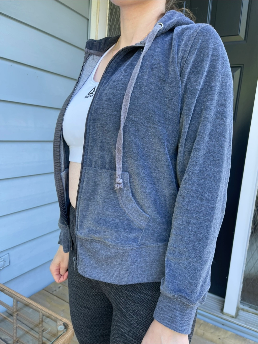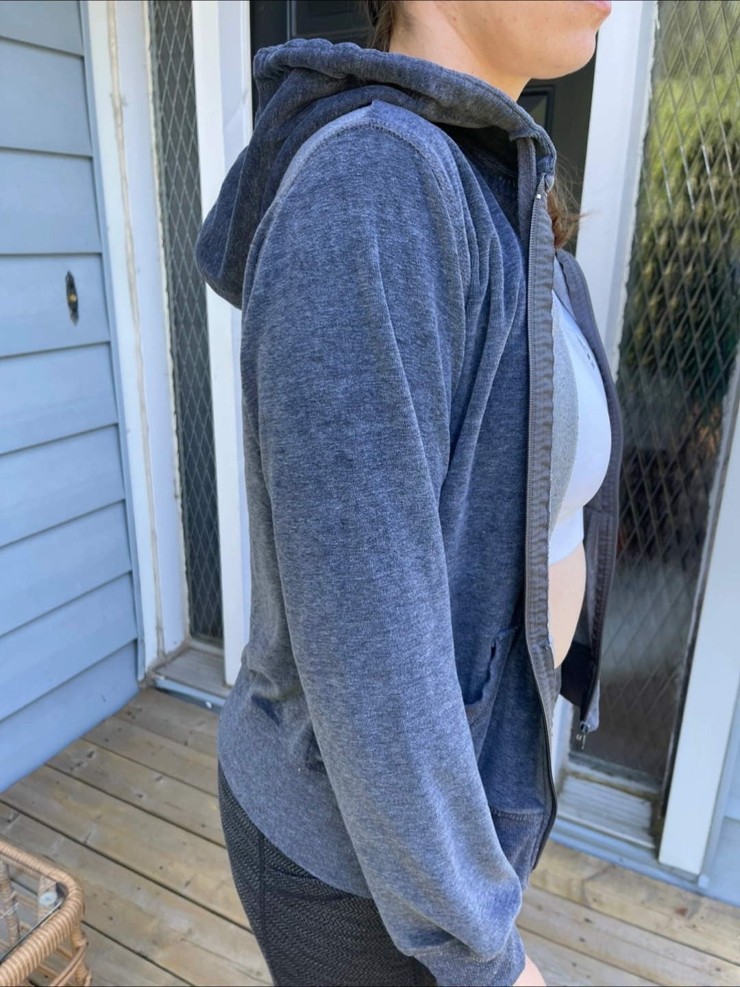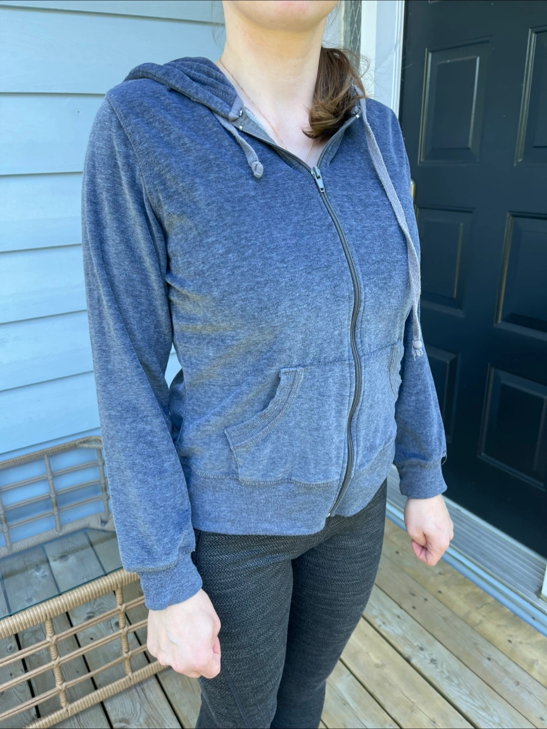 MIKK Couture Athletica hoodie in a lovely blue-grey colour. It's a size L/G and made of 80% cotton and 20% polyester. Machine wash cold on gentle cycle, wash dark colours separately, do not bleach, hang to dry, and low iron on reverse side Model size in the photo - M.