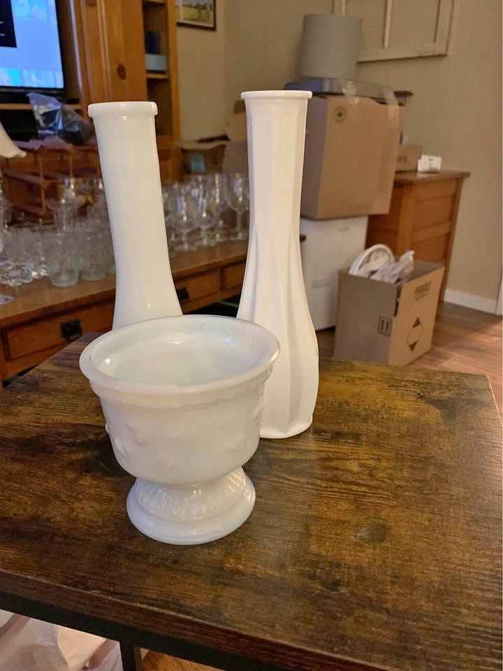 0Two tall vases and one short bud vase made of milk glass. Bud vase on right is made at the Brody Co., Cincinnati Ohio.