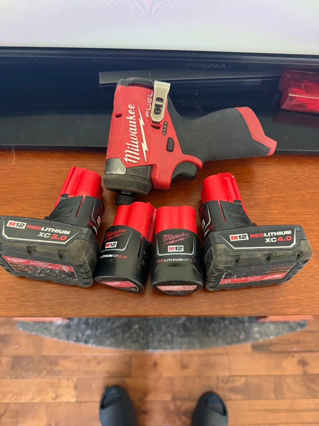 Selling a Milwaukee M12 Fuel impact driver along with a few batteries! There are two M12 Red Lithium XC 4.0 batteries, one M12 Red Lithium CP 2.0 battery, and one M12 Red Lithium CP 3.0 battery