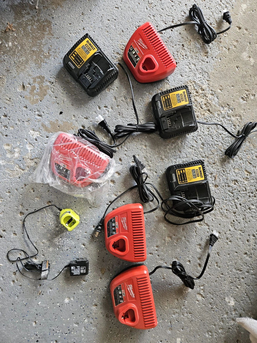 Bundle of six Milwaukee M12 Lithium-Ion battery chargers. Various models included. Great for contractors or DIY enthusiasts. Pre-owned, but in good working condition.