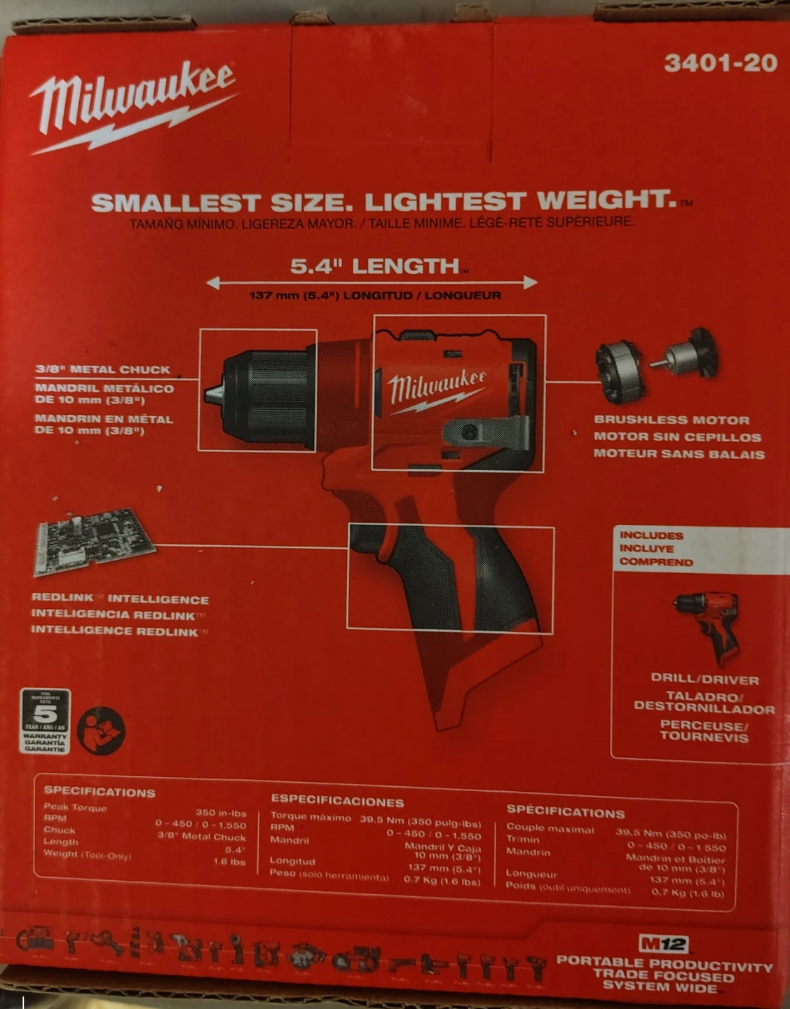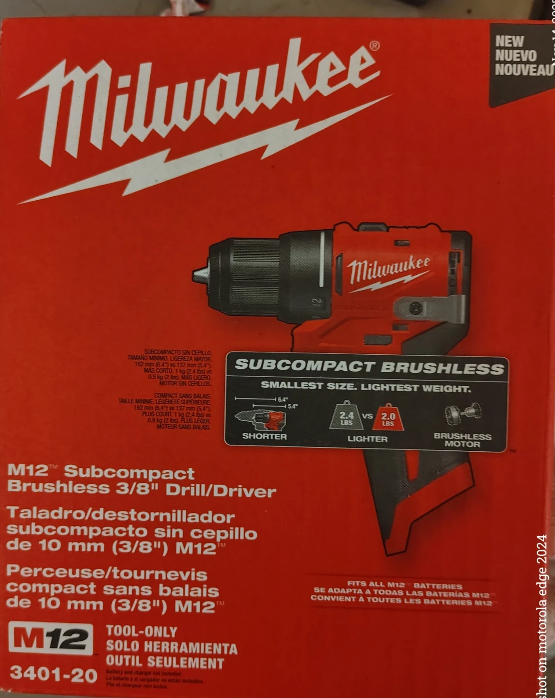 60Selling a brand new Milwaukee M12 Subcompact Brushless 3/8" Drill/Driver. It's the smallest size and lightest weight! - 5.4" length - 3/8" metal chuck - Brushless motor It fits all M12 batteries.