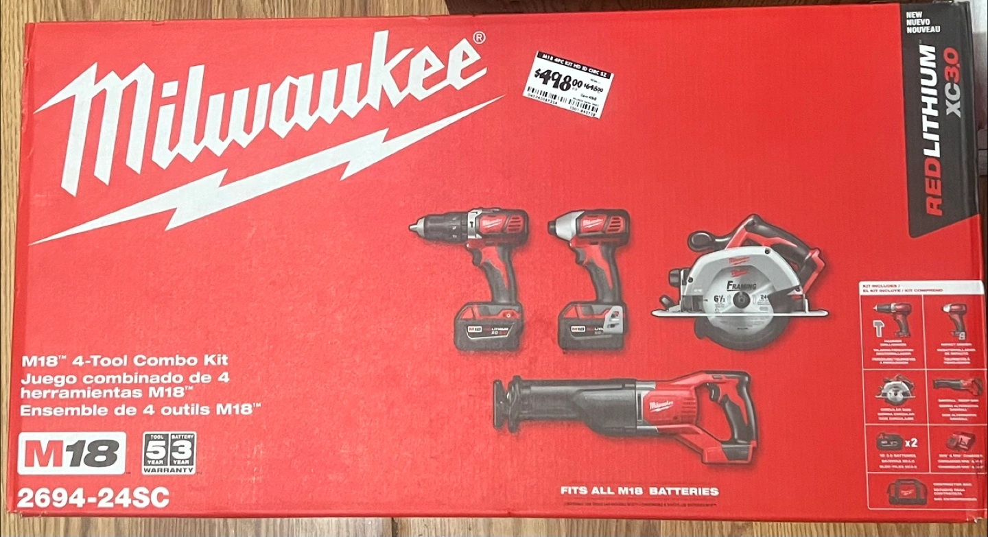 96Selling a Milwaukee M18 4-Tool Combo Kit. This kit includes a variety of tools to help you with your projects. Originally bought for $498.00+tax It fits all M18 batteries.