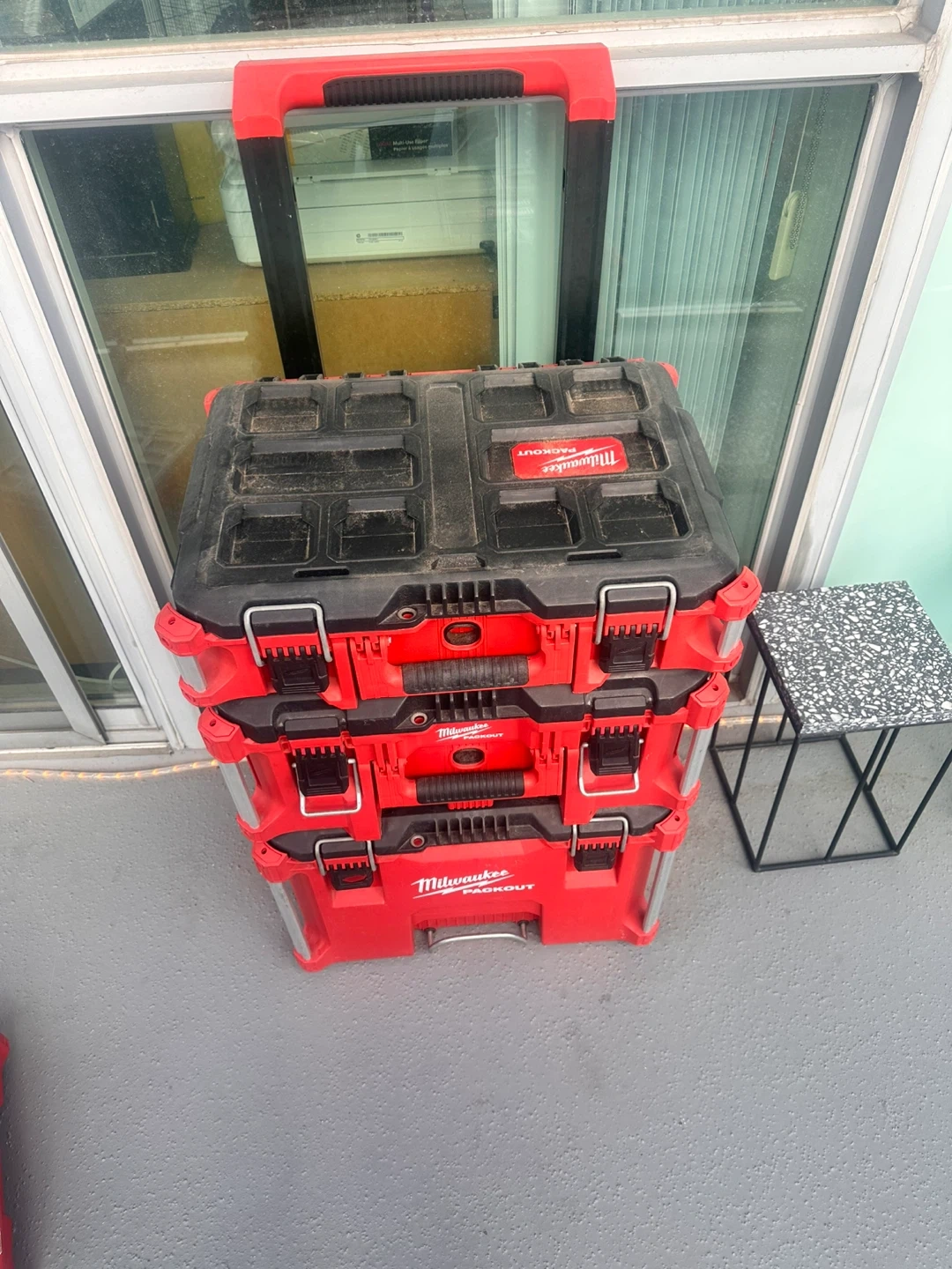 0Selling a Milwaukee PACKOUT rolling tool box set. It's in great shape and ready to organize your tools! This set includes the rolling tool box, tool crate, and tool box. Perfect for any job site or garage!