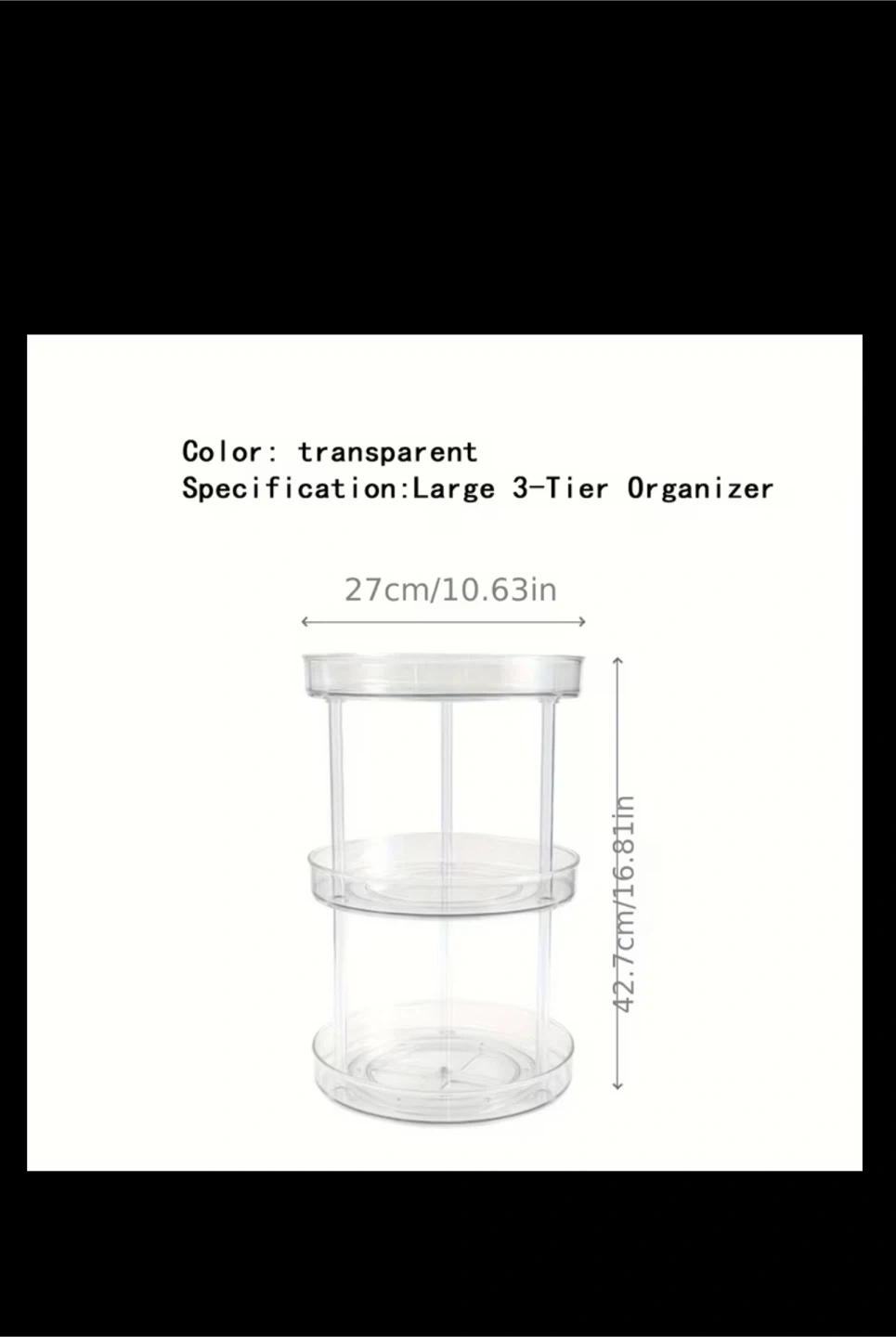 This is a 3-tier rotating organizer with a clear, transparent finish. It's designed for easy glide and rotates 360 degrees using a quiet ball bearing system. Dimensions are 27cm wide and 42.7cm tall.