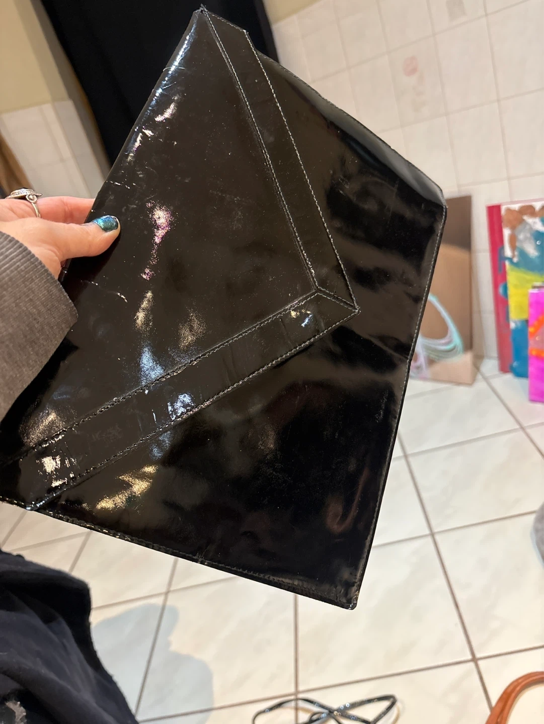 A sleek black patent leather clutch. It features a zippered interior pocket and a patterned lining. Perfect for a night out!