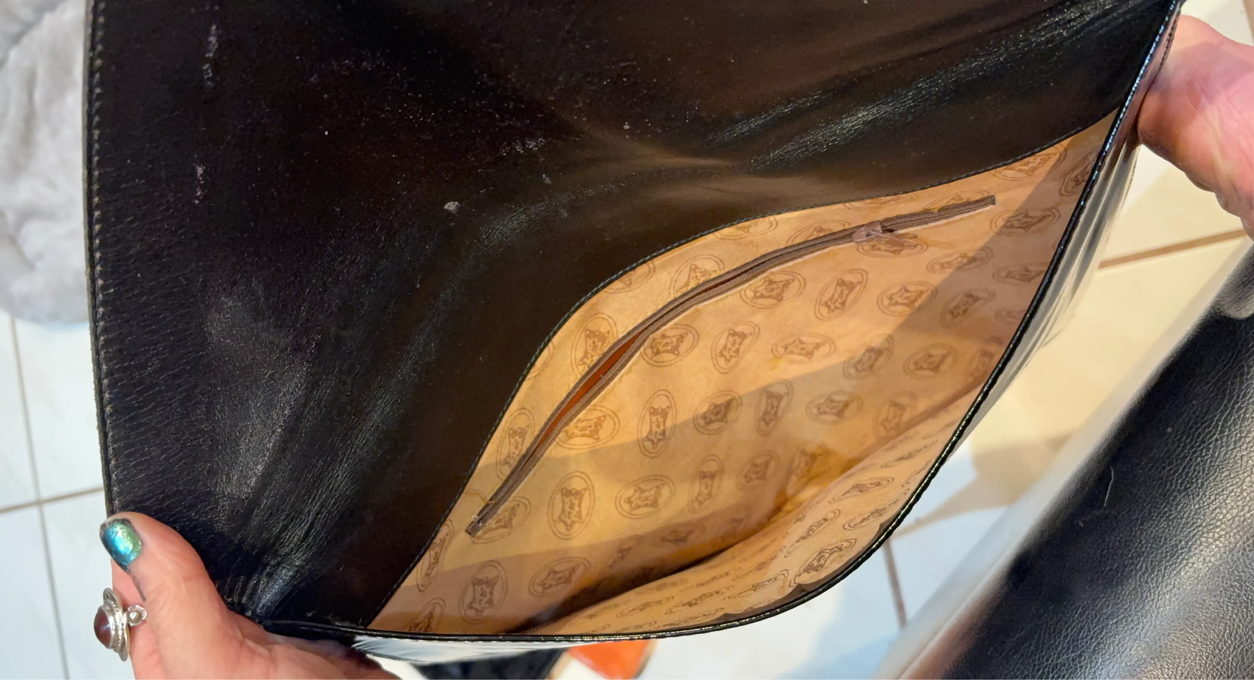 A sleek black patent leather clutch. It features a zippered interior pocket and a patterned lining. Perfect for a night out!