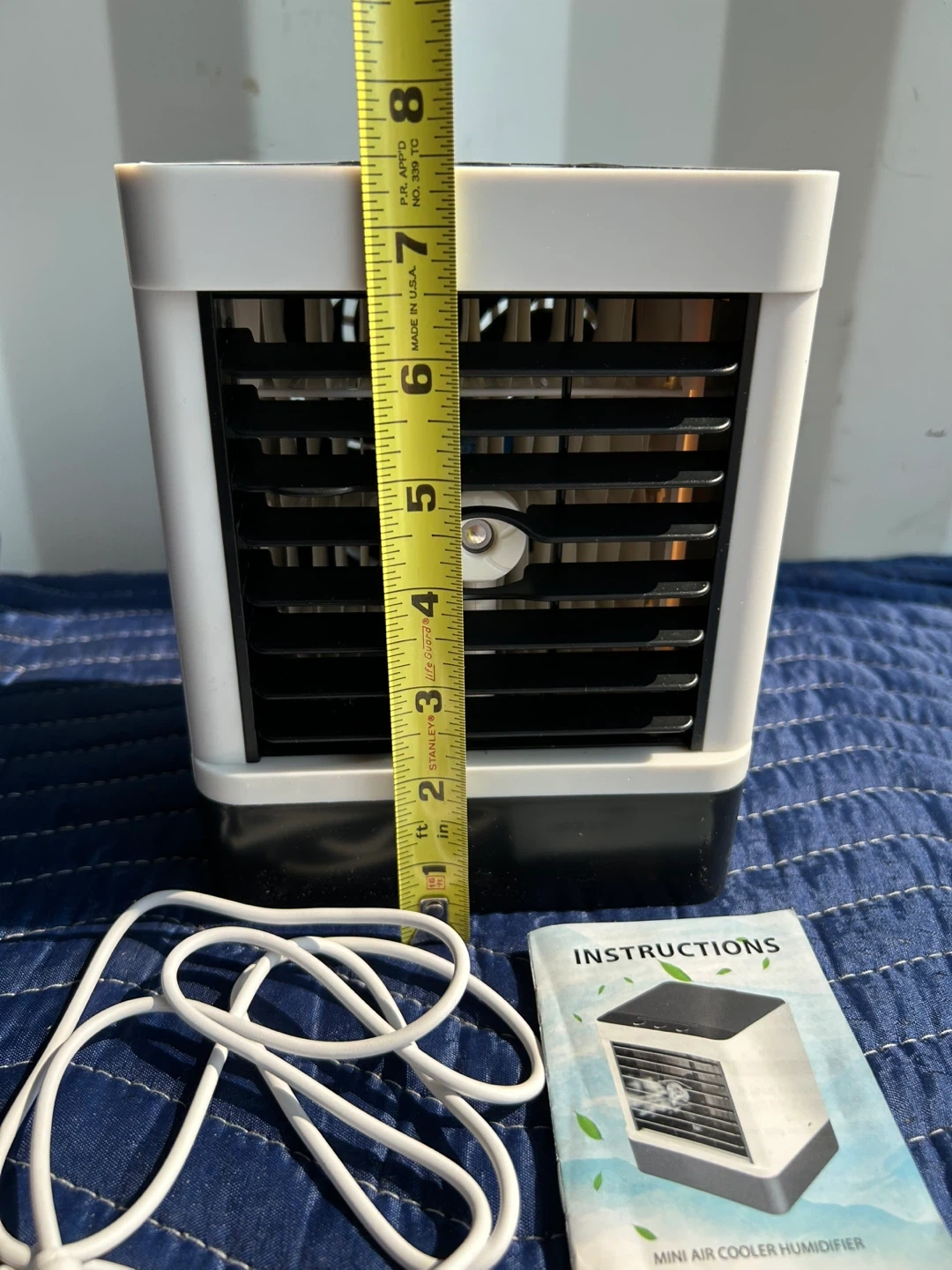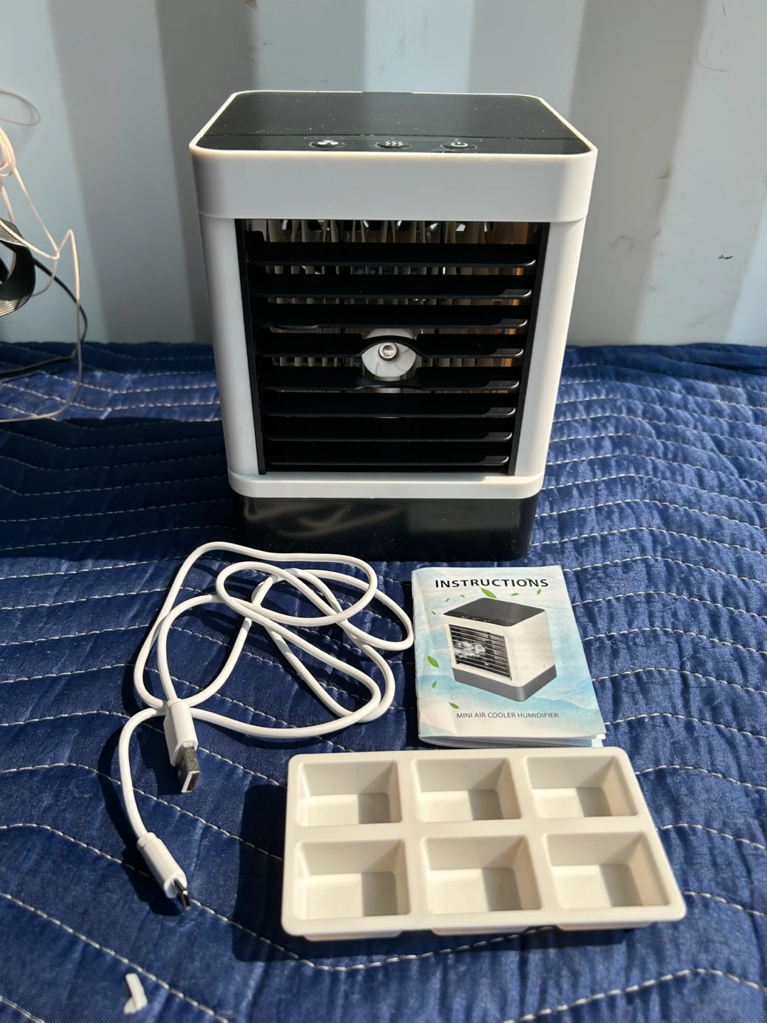 Selling a brand new mini air cooler and humidifier, still in its original packaging! It features strong cold wind and spray humidification. Included are the instructions and charger. This is perfect for creating a cool and comfortable environment in your personal space