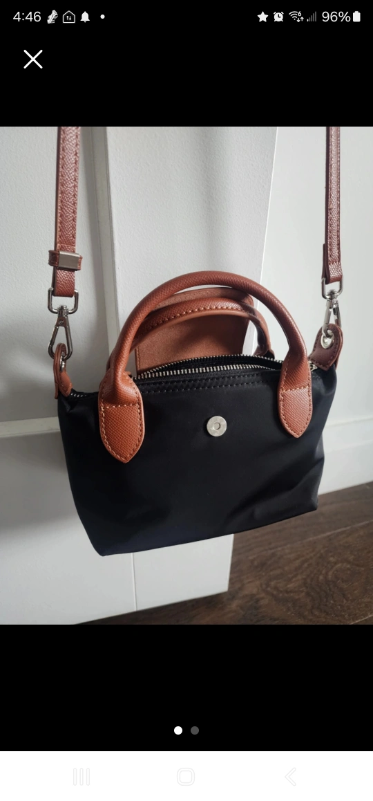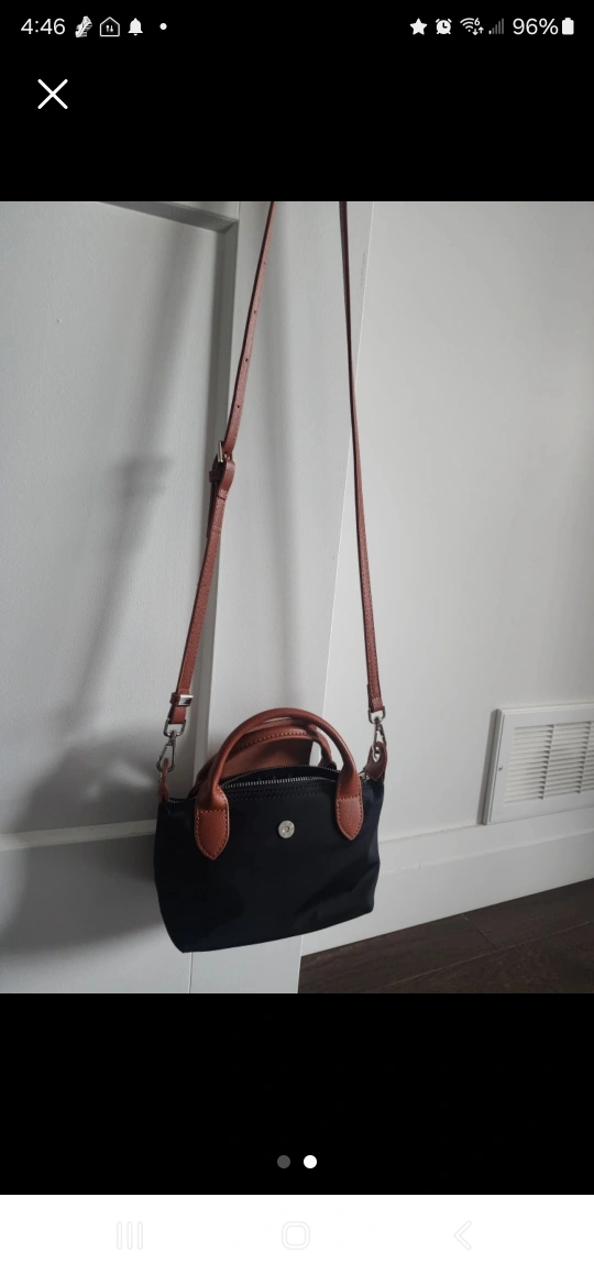 Black nylon mini handbag. Brown leather trim. Top handles and long shoulder strap. Zipper closure. Small, lightweight, and stylish.