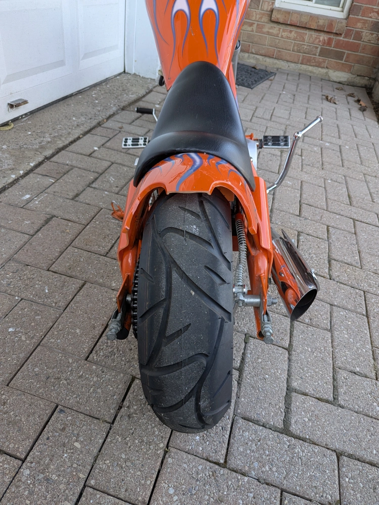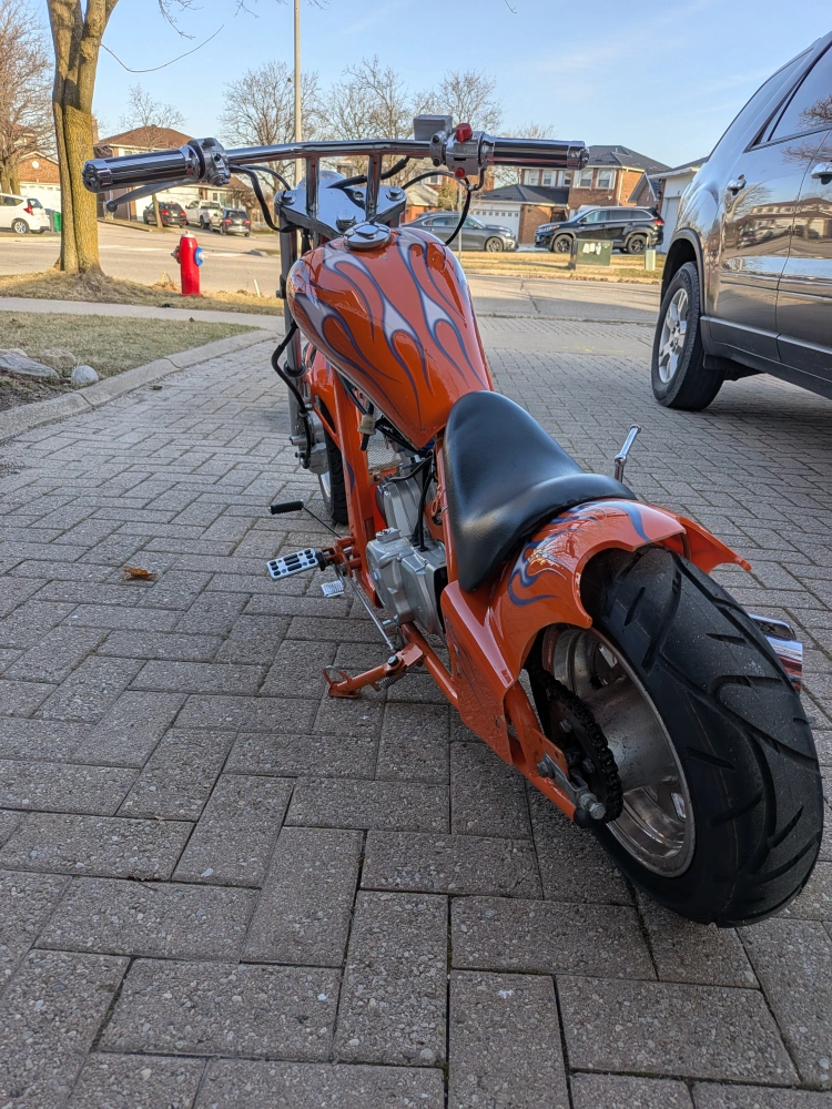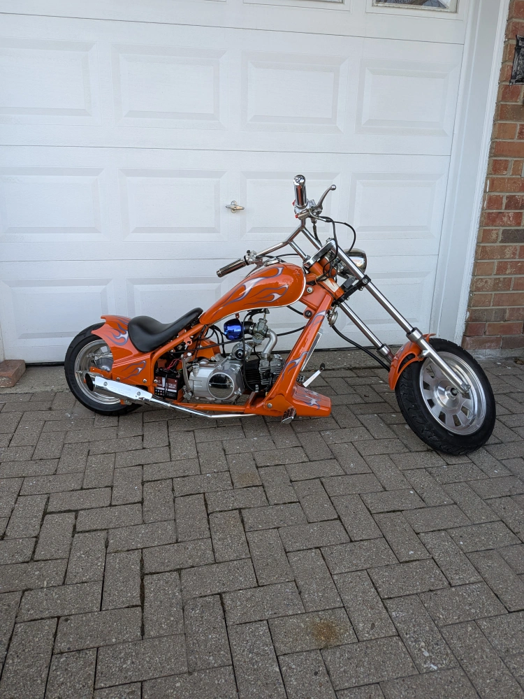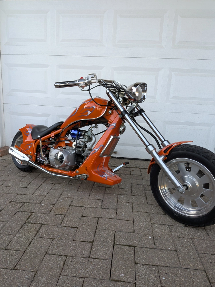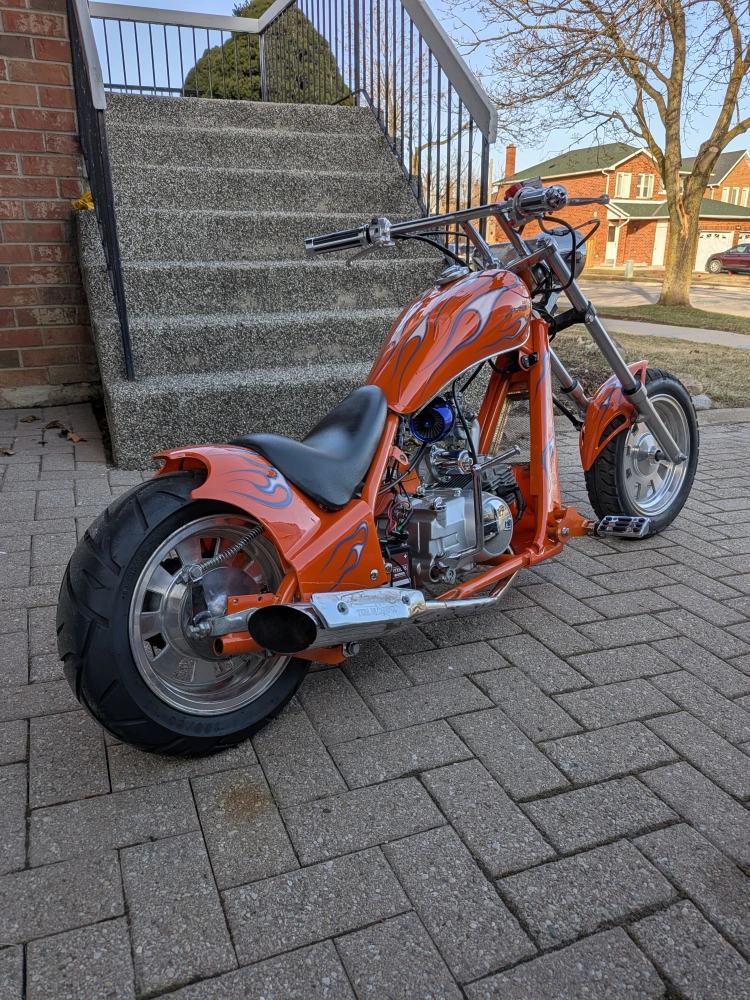 Mini chopper motorcycle with a 4-stroke engine, likely 125cc or 110cc, and a 4-speed manual transmission. Features both electric and kick start. The bike is clean, well-maintained, and runs well. Great for collectors, bike enthusiasts, or as a unique display piece.This bike is not street legal – meant for off-road use or private property riding.