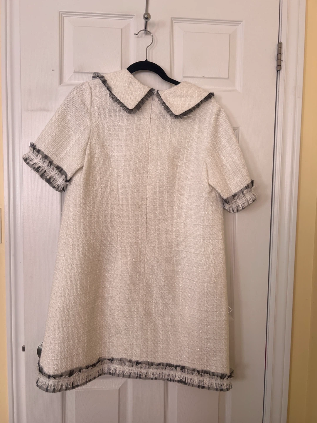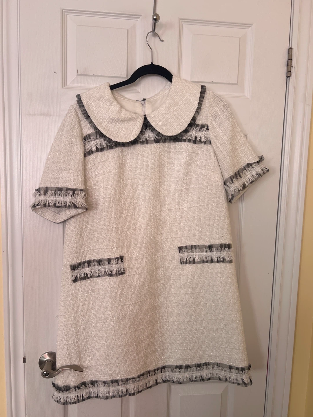 10Selling a cute tweed mini dress with a stylish collar. It has short sleeves and a classic design, perfect for a chic look. The dress features delicate detailing and a comfortable fit. It's in great condition and ready for a new home!