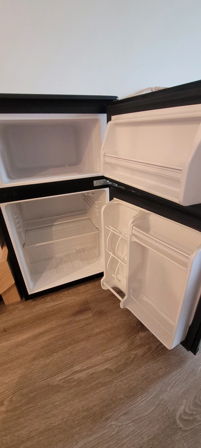 Compact mini fridge, black colour. Two compartments, freezer on top. Shelves and door bins included. Perfect for small spaces. 33 " H 19" x 20"
