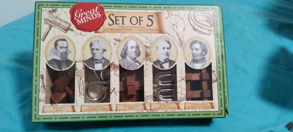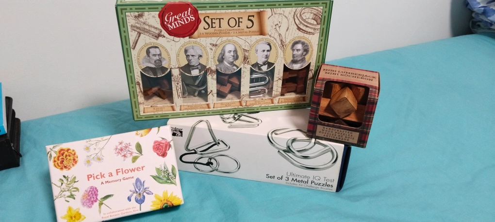 48-Handcrafted wooden puzzles. -Set of five includes various designs. -3 sets of Metal puzzles. -pick a flower memory game Great for brain teasers.