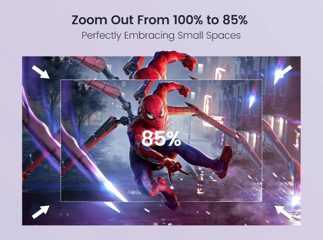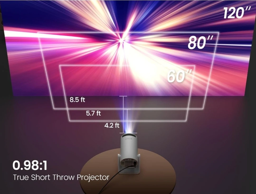 44➤【2025 Upgraded 0.98:1 True Short Throw Projector】Compared to others, it saves you 5ft of distance for a 100" screen. A shorter throw distance decreases optical distortion, delivering sharper and more accurate images. Offering a projection size range of 40~200 inches with distances from 2.8ft to 14ft, it has 4:3 and 16:9 aspect ratios and zoom out for a versatile viewing experience. Whether you're in a cozy attic, bedroom, RV, or a larger space, this mini projector seamlessly adapts to your environment. ➤【Mini Projector 270° Built-in Stand】More stable triangular stand, allowing you to effortlessly adjust the angle for the perfect viewing experience. Weighing only 1.32 pounds net, the mini projector is compact but not simple, and can instantly project your movies to the ceiling. Take it anywhere, and savor high-quality visuals, whether you're indoors or outdoor. ➤【Auto Keystone Correction & 1080P Supported】Say farewell to distorted images with our auto vertical keystone correction, enjoying your home theater without alignment concerns. With 1080P supported resolution and remarkable 15000:1 high dynamic contrast ratio, it faithfully reproduces real color content. Additionally, benefit from convenient features like Online Update(OTA), Auto Sleep mode, and Brightness & Color Temperature Adjustment. ➤【2.4G/5G WiFi & Bluetooth 5.2】Dual assurance with both 5G and 2.4G speedy WiFi options, along with dependable wired connections. In addition to wireless screen mirroring through Miracast and Airplay, Portable projector supports wired screen mirroring, enabling seamless YouTube streaming under a wired connection. Connect Bluetooth headphones, speakers, or AirPods more stably with Bluetooth 5.2.