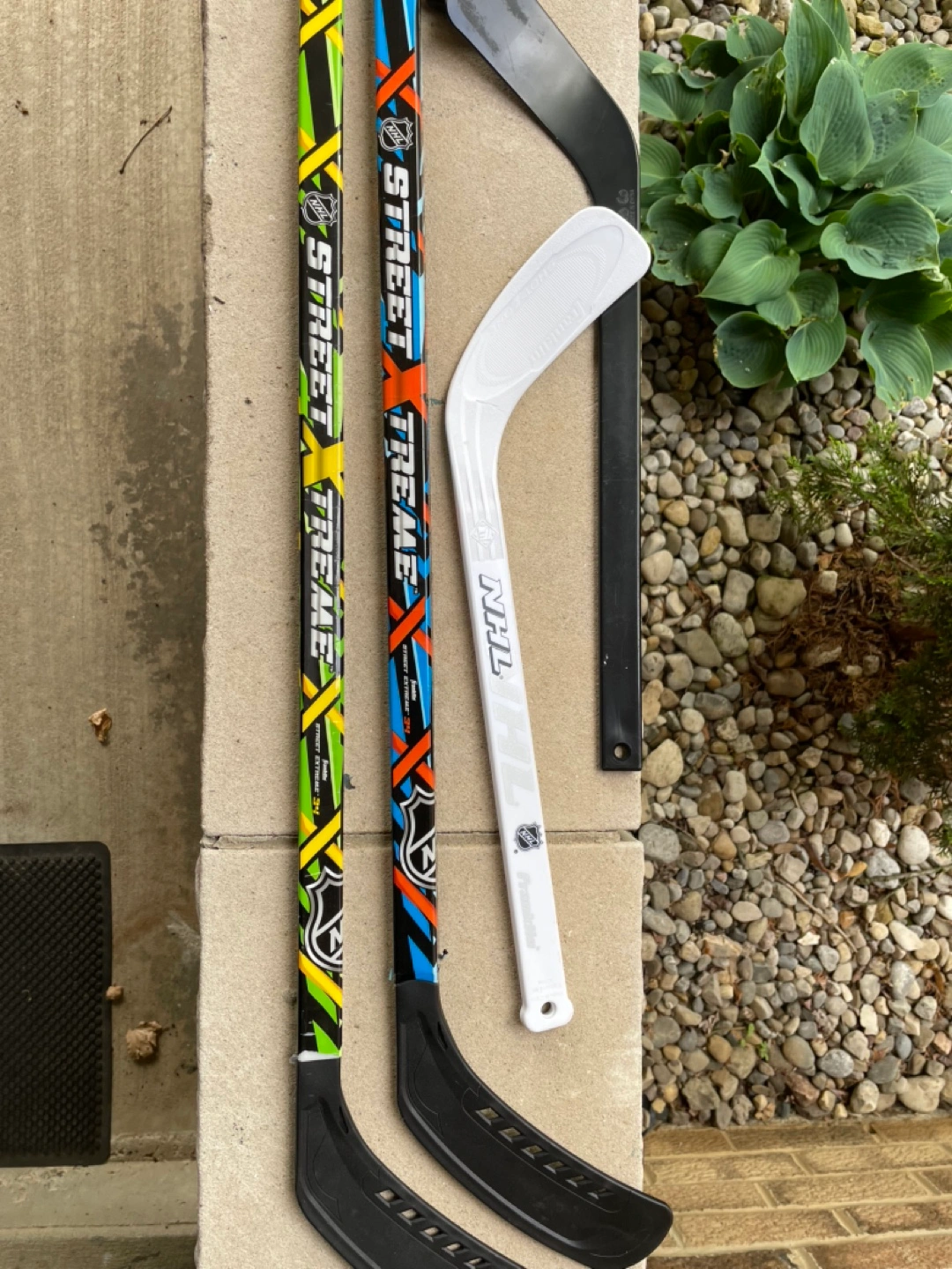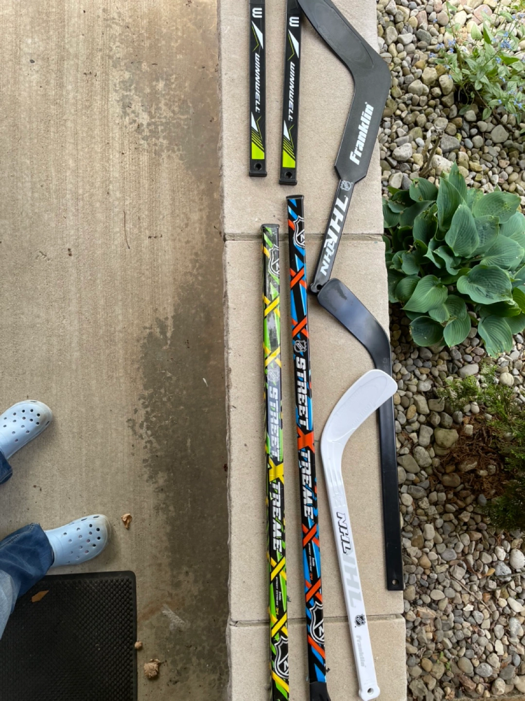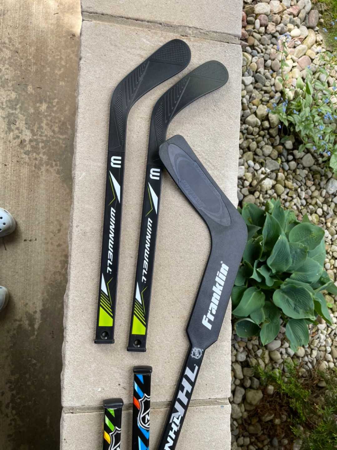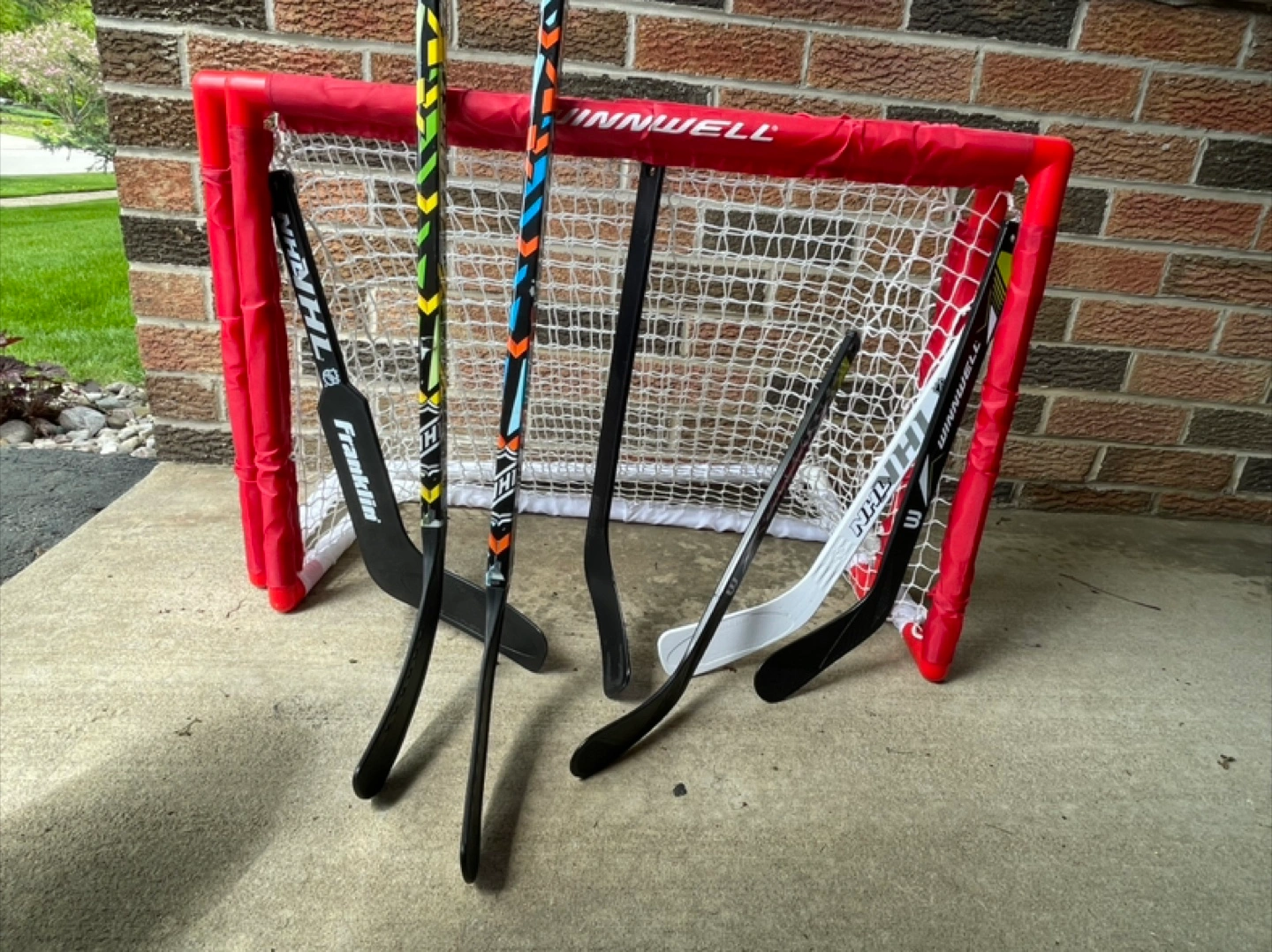 12Two Mini stick net and seven hockey sticks, Left and right handed, goalie stick and flat stick. Excellent condition - Perfect for indoor fun !!