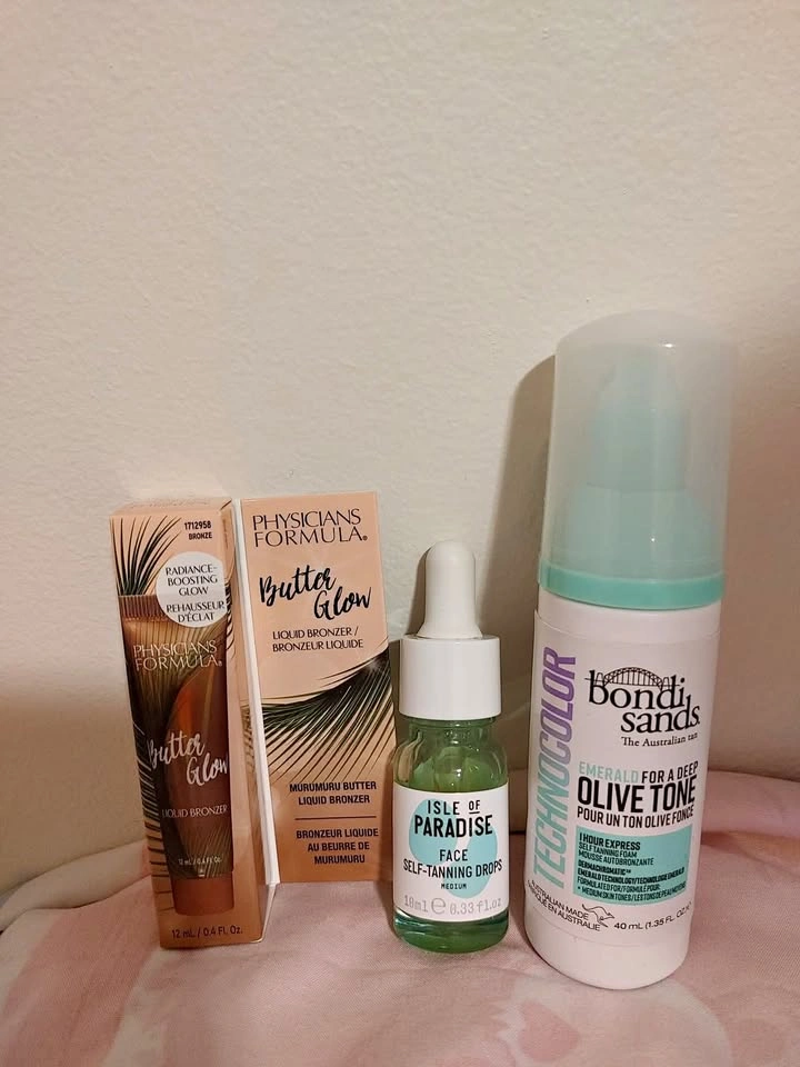 25Mini tanning sprays and bronzer: (1) physicians formula butter glow bronzer 12 ml (1) Isle of Paradise - Face Self Tanning Drop 10ml = 2 for $10 + (1) bondi sands 40 ml olive tone - Free None of them has ever been opened and kept in original packaging Came as part of 'favorites' and sets from Sephora and Shoppers