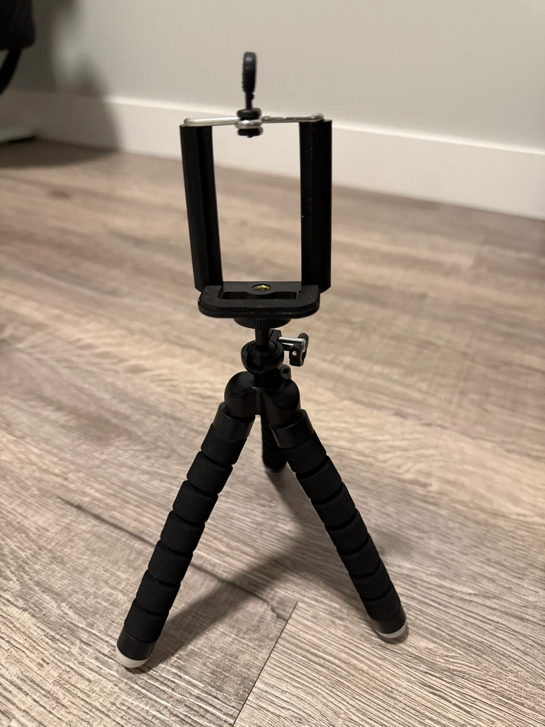 Selling a handy mini tripod, perfect for taking photos or videos with your phone! It's black and comes with a phone holder attachment. Great for setting up stable shots on the go